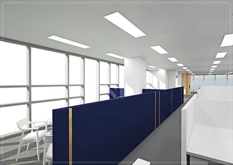 사무공간의 전경입니다. 위에서 설명해드렸듯이 화이트톤을 이용해서 사무공간을 인테리어 해보았으며 좌측의 테라스 같은 경우에는 남색을 사용한 가벽을 이용해서 사무공간안에서의 공간적인 분리를 한번 더 해보았습니다. 사무공간 내부에 있는 파티션 또한 단순하게 화이트톤을 사용한 것이 아닌 중간마다 그레이톤을 넣음으로써 공간적인 디자인을 한층더 살려보았습니다.