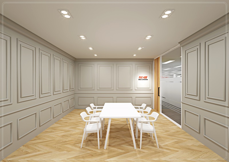회의실의 내부 전경입니다. 두가지의 버전을 준비해보았는데 하나는 사무공간과의 연결성을 위해서 화이트톤의 외벽을 사용한 후 한쪽 벽면만 우드 인테리어를 사용해서 깔끔함을 강조한 것 입니다. 다른 버전은 사무공간과의 통일성을 버리고 회의실만의 독창성을 살린 것 입니다. 이 버전은 벽에 웨인스코팅 기법을 사용해서 우아함을 더 추가해보았고 바닥도 문양을 변경하였습니다.