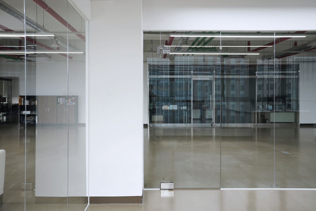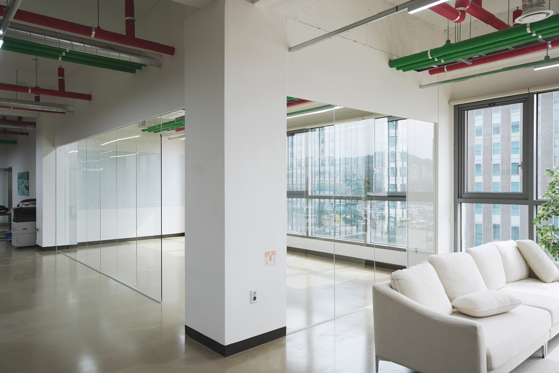 유리가벽은 단절된 느낌 없이 시각적 확장감을 제공하며, 내부에서 회의를 진행할 때 외부와의 소통을 차단해