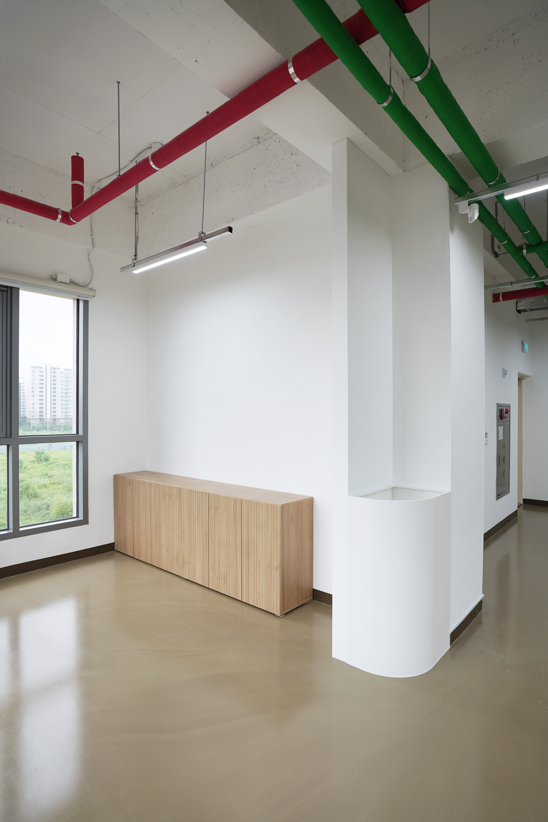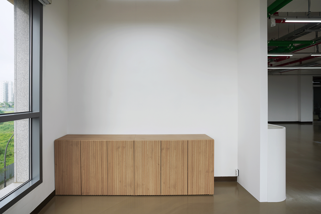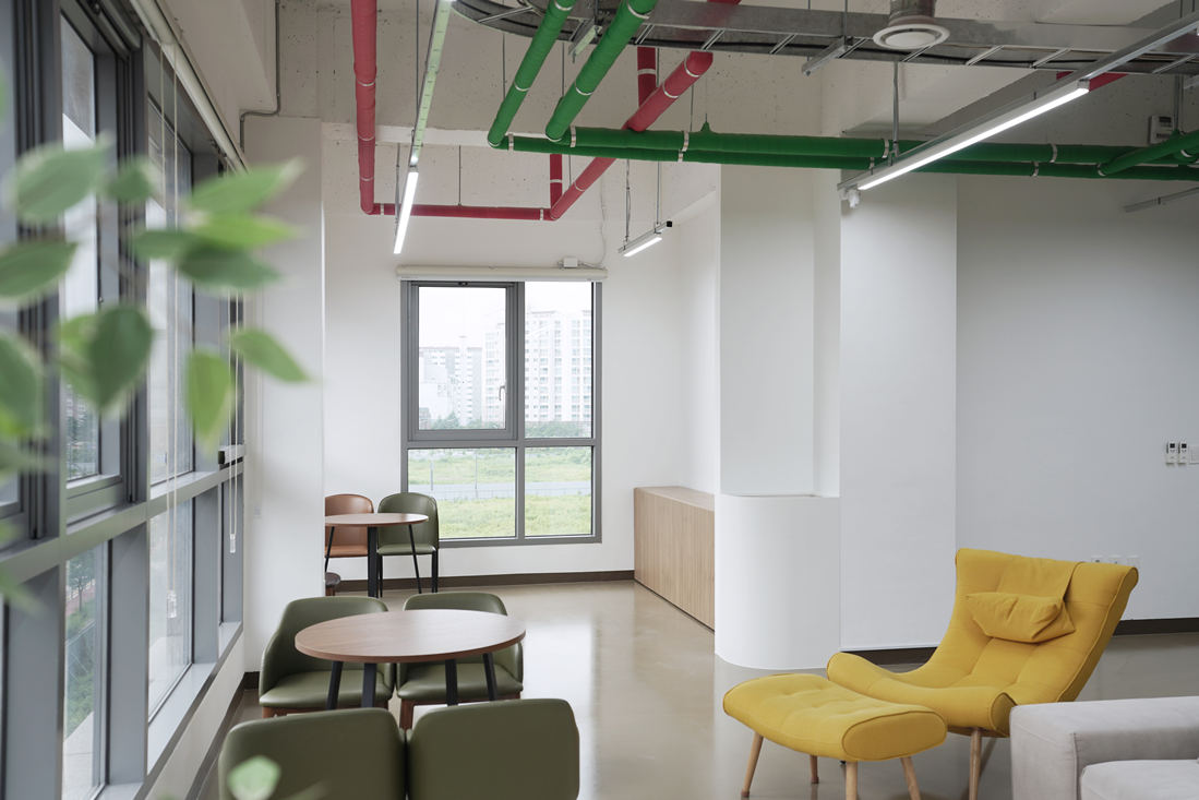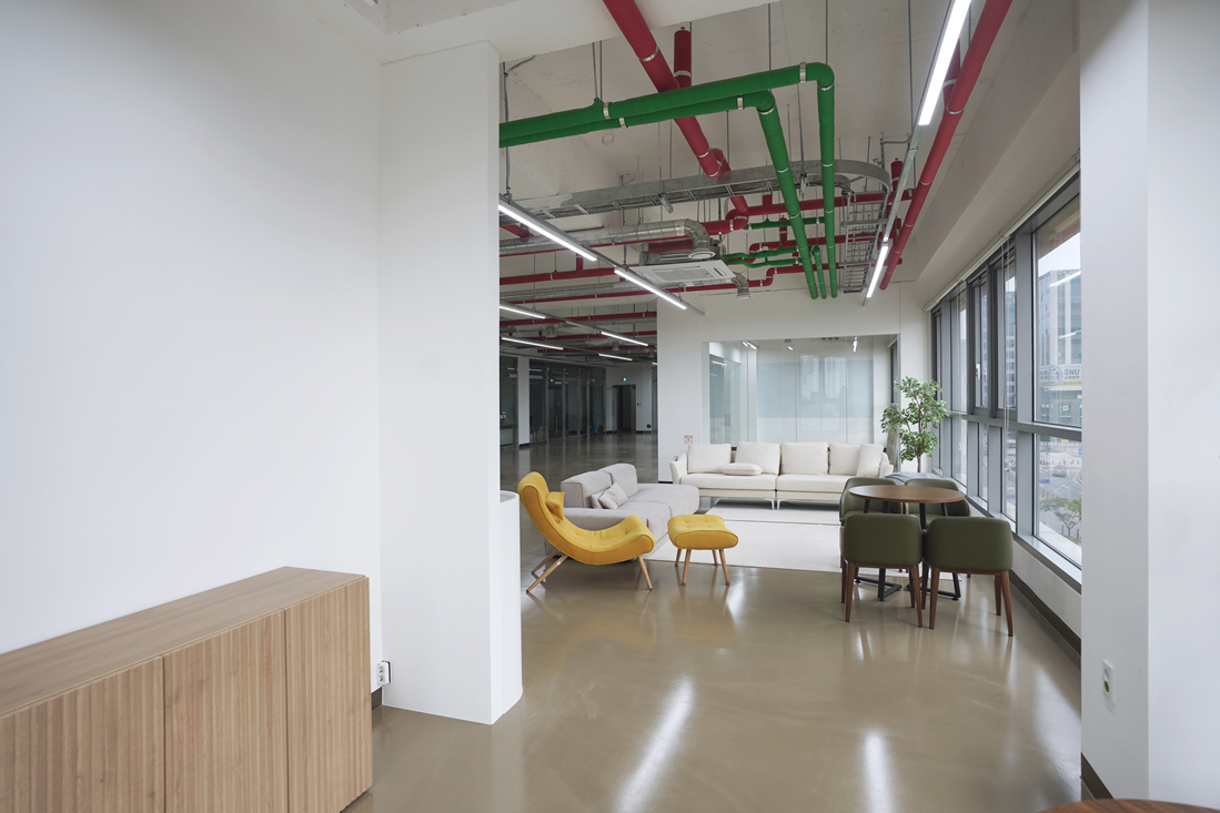 또한 한쪽에는 4인용 원형 테이블과 그린 컬러 체어를 배치하여 소규모 미팅이나 팀회의,