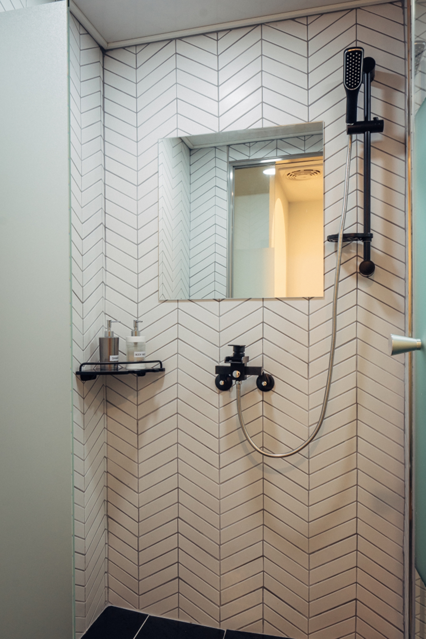 샤워실 공간인데요 헤링본 화이트톤 타일을 활용하여 퀄리티있게 마감 처리 하였습니다. 헬스장인테리어 피티샵 휘트니스 공사를 진행하다 보면 샤워공간에 대한 소홀함이 많지만 최대한 전체적인 분위기에 맞게 시공을 진행하고 있습니다.