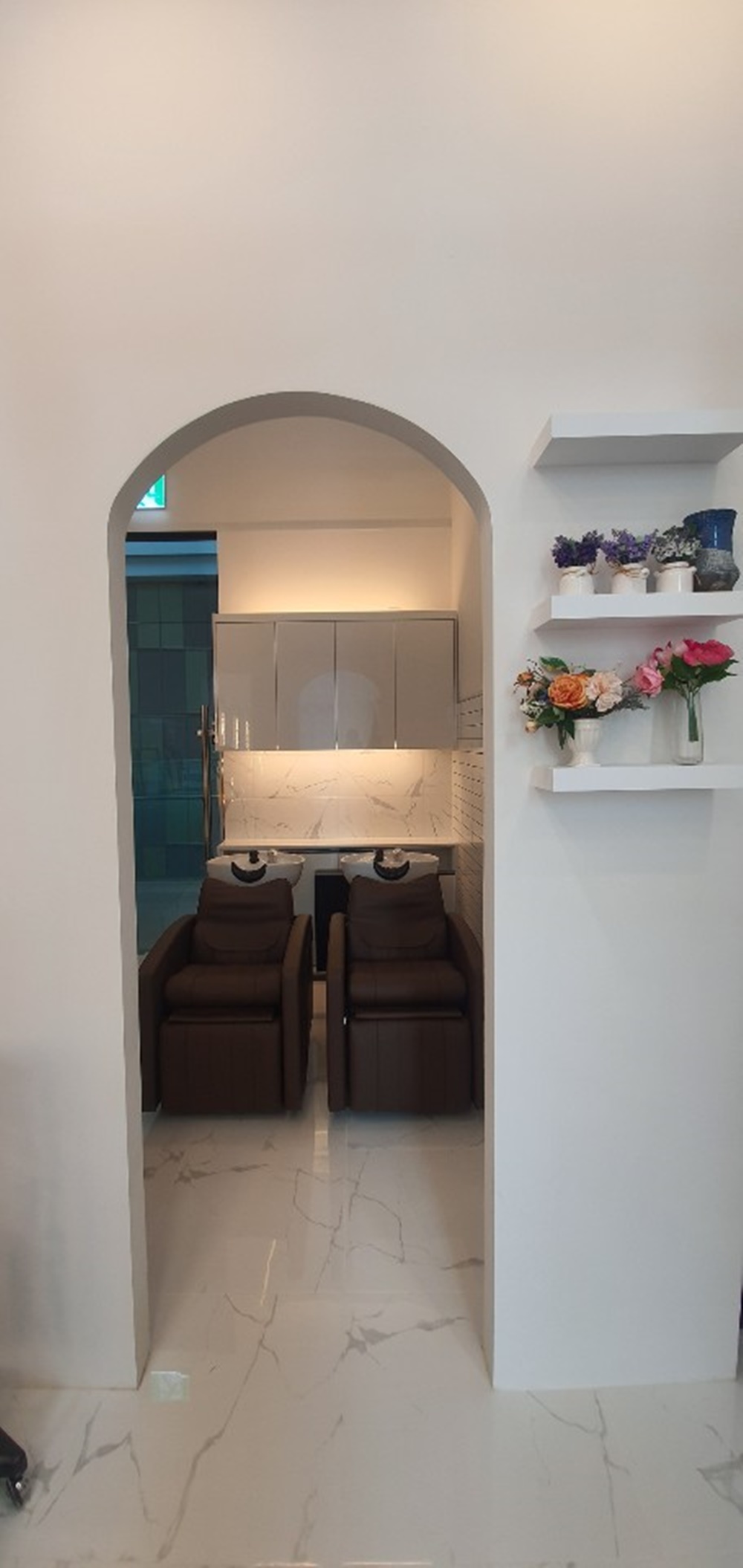 그리고 아치 모양의 부분 파티션으로 샴푸실 영역을 구분했는데 완전히 분리되지 않으면서도 프라이버시는 보호되는 효과적인 설계 방식을 보여주는 것이죠.