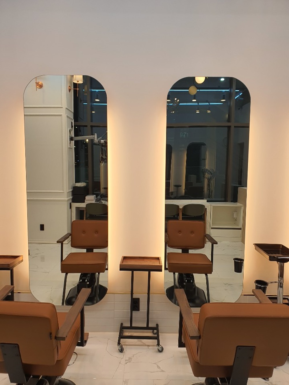 경대 사이는 1,100mm 간격으로 설치하여 고객과 미용사 모두 편안함을 느낄 수 있도록 했어요.