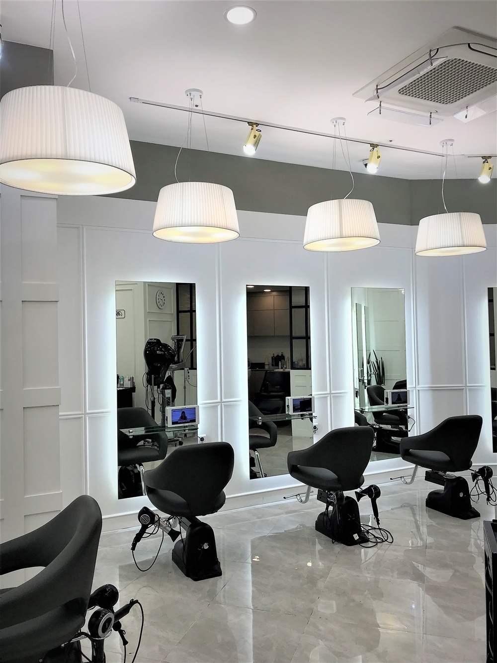 전체적으로 군더더기 없는 깔끔한 디자인으로 소형 미용실임에도 고급스러운 느낌을 주는 인테리어를 완성했죠.