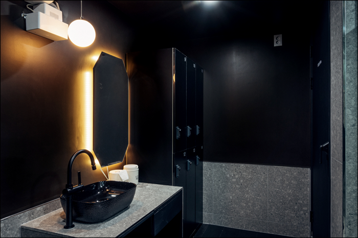 탈의실에는 8각형의 장신 거울을 설치하여서 조금 더 세련된 느낌을 강조해보았습니다. 뿐만 아니라 앞에는 우아한 느낌이 나는 동그란 조명을 달아서 고객들이 운동을 한 후에 자신의 몸을 조금 더 멋지게 볼 수 있도록 조성을 해보았습니다. 늘 새로워지는 본인의 모습을 보면서 빛나는 몸을 가지고 싶다면 이런 모던한 인테리어를 하는 것도 하나의 방법입니다.