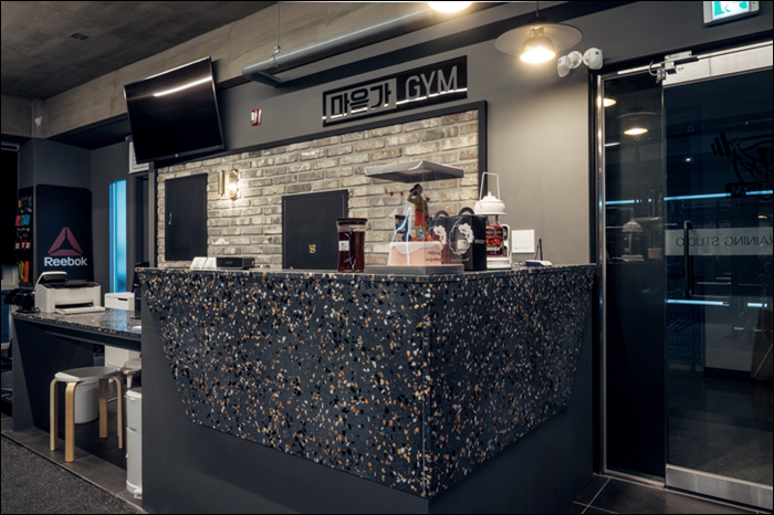 안내 데스크 같은 경우에는 헬스장의 세련미를 높이기 위해서 검정색 바탕에다가 얼룩덜룩한 포인트를 넣어서 인테리어를 해보았습니다. 한쪽면에서는 세련된 헬스장의 모습을 볼 수 있는 반면에 다른 한 쪽 면에서는 유리문과 헬스장 로고를 보는 모습이 마치 사우나에 온 것 같은 풍경을 연출하기도 하였습니다. 데스크 바로 우측에는 수건을 배치하여서 고객들이 언제나 편하게 사용하실 수 있도록 하였습니다.