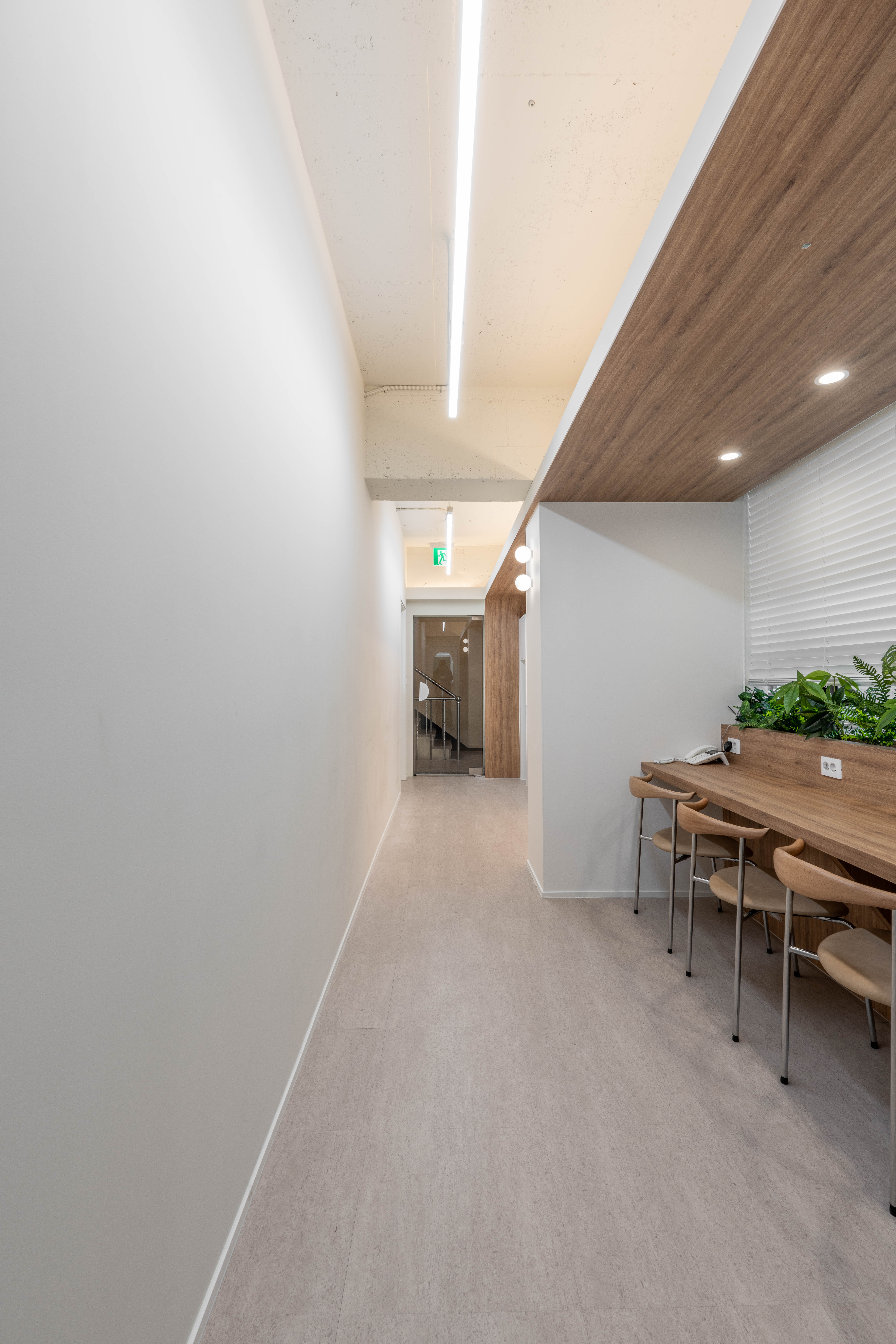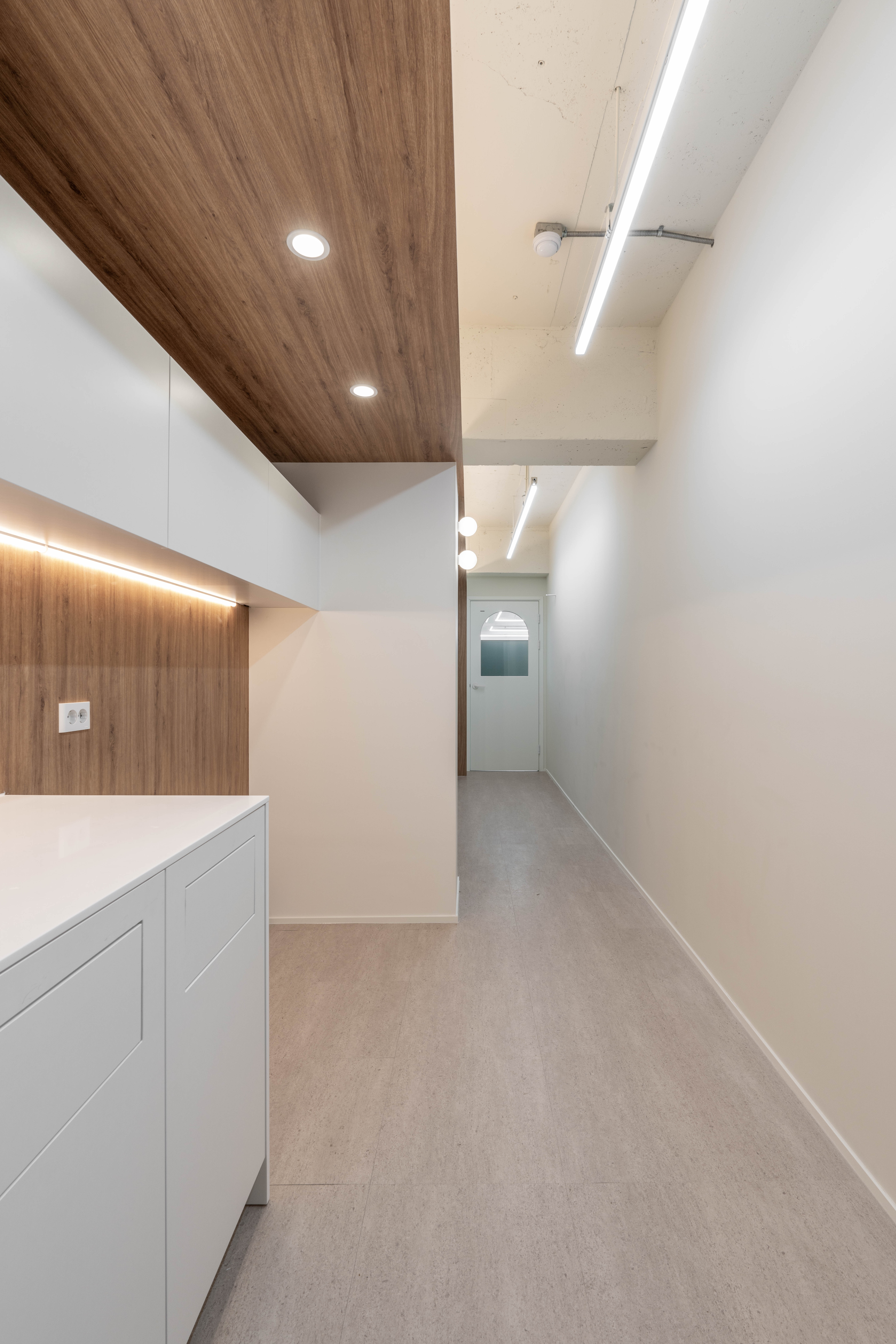 복도처럼 긴 이 공간은 화이트와 우드 조합으로