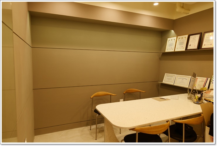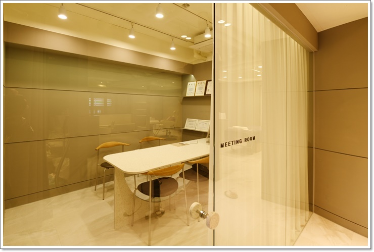 카운터에서 안쪽으로 들어가면 미팅룸이 위치하고 있습니다. 고객과의 상담을 할 수 있는 공간으로 깔끔하게 앞쪽 부분은 유리를 넣어 드리고 커튼으로 막아 독립된 공간으로 보이고 있습니다.