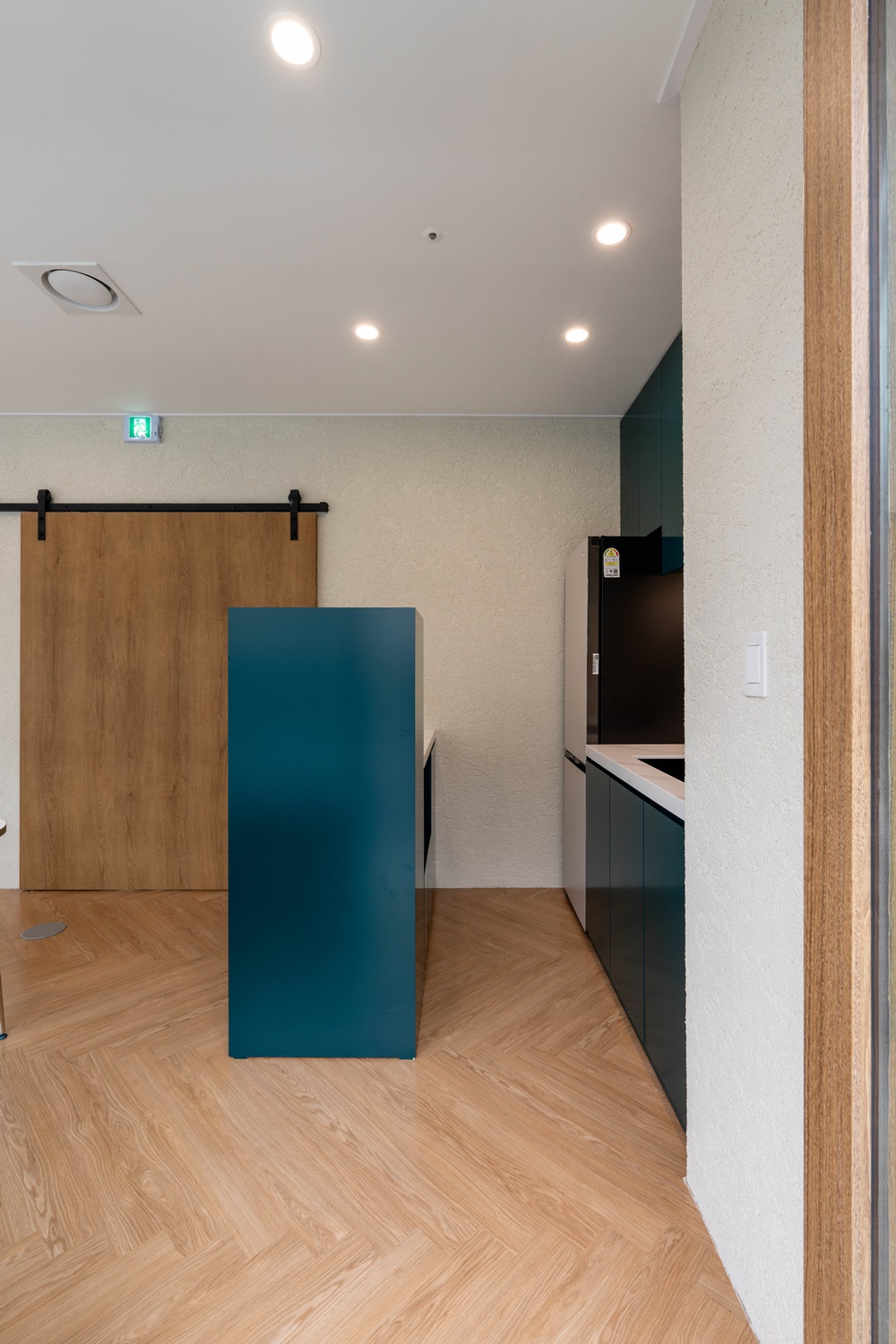 기존의 단순한 탕비실을 바테이블이 설치된 카페테리아로 전환하면 직원들의 휴식과 소통 공간으로 활용도가 높아지죠.