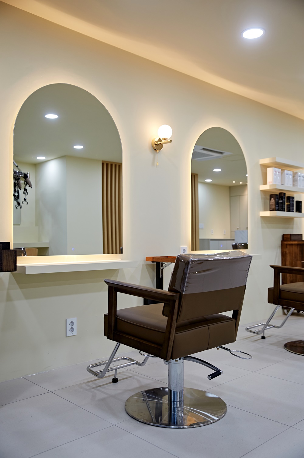 미용실 벽면에는 감적적인 조명 기기 등을 추가하여 공간의 품격을 높여주었어요.
