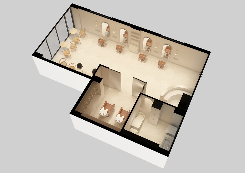 샴푸 구역, 스타일링 구역, 대기 공간 등 각각의 목적에 맞게 분리하여 레이아웃을 구성해 보았는데요.