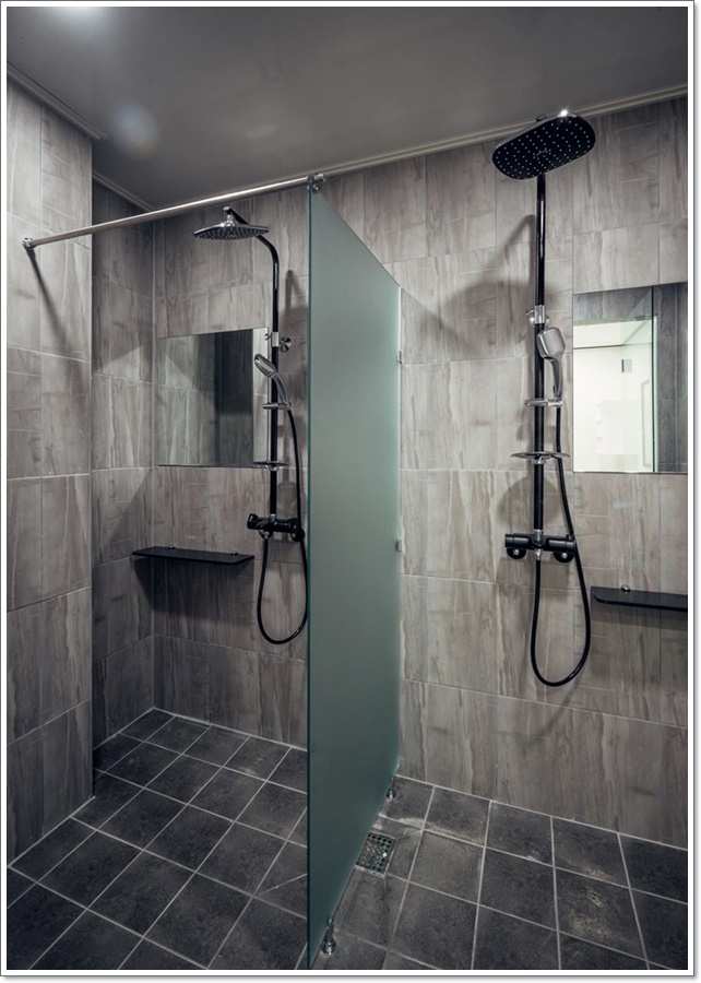 운동의 끝을 마주치는 샤워장 같은 경우에는 아쿠아 유리를 이용하여서 샤워를 하는 사람들간의 노출도를 최대한 감소시켰고 무엇보다 중요하게 전체적으로 그레이톤의 천장과 바닥을 인테리어함으로서 청결함이 느껴질 수 있도록 구성하였습니다. 조명은 어두운 조명을 사용하여서 샤워를 할 때 조금 더 편안함을 가질 수 있도록 연출을 해보았습니다.