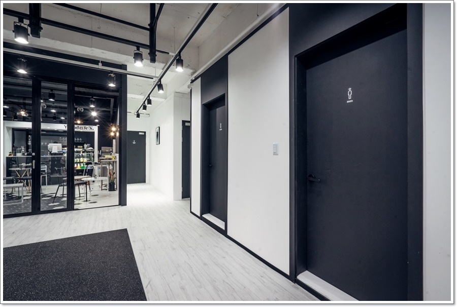 헬스장의 출입문 같은 경우에는 화이트톤의 외벽과는 차이점을 주기 위해서 검정색 미닫이문을 선택하여서 설치해보았습니다. 이는 화이트톤으로 연출이 되어있는 전체적인 실내의 하나의 포인트를 넣은 것과도 같습니다. 뿐만 아니라 검정색으로만 구성이 되어 있어서 밋밋하고 심심할 수 있는 문의 중심에는 기업 로고를 넣어서 약간의 섬세함을 추가시켰습니다.