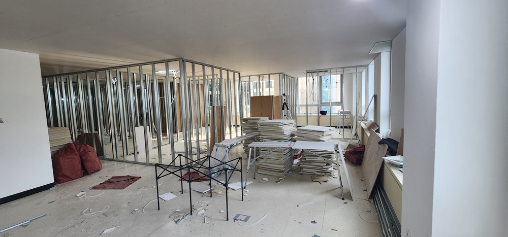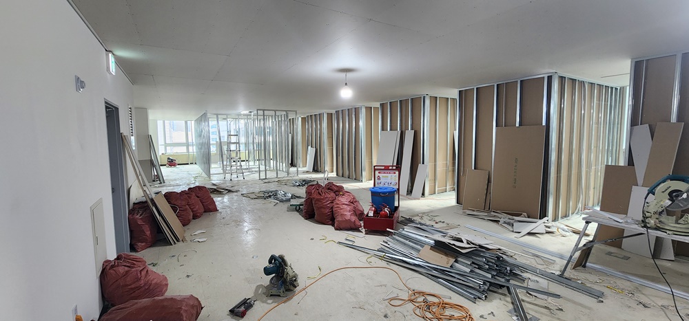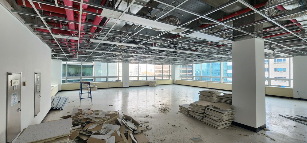 천장의 대형 바리솔 조명설치를 위해 전기 배선 및 프레임 작업을 선행했으며, 바닥재는 내구성이 뛰어나면서도 보행감이 부드러운 고급 카펫 타일을 선정해 시공했습니다.