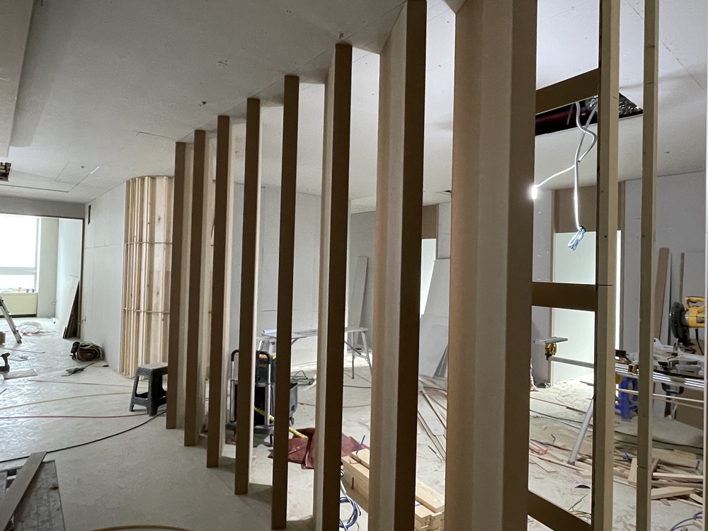 로비의 곡선형 벽체와 수직 루버는 한 치의 오차도 허용하지 않는 정밀한 목공 작업이 요구되었습니다.