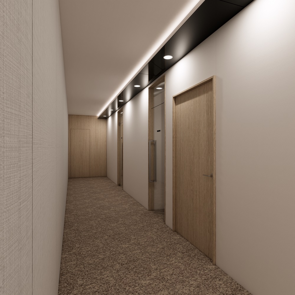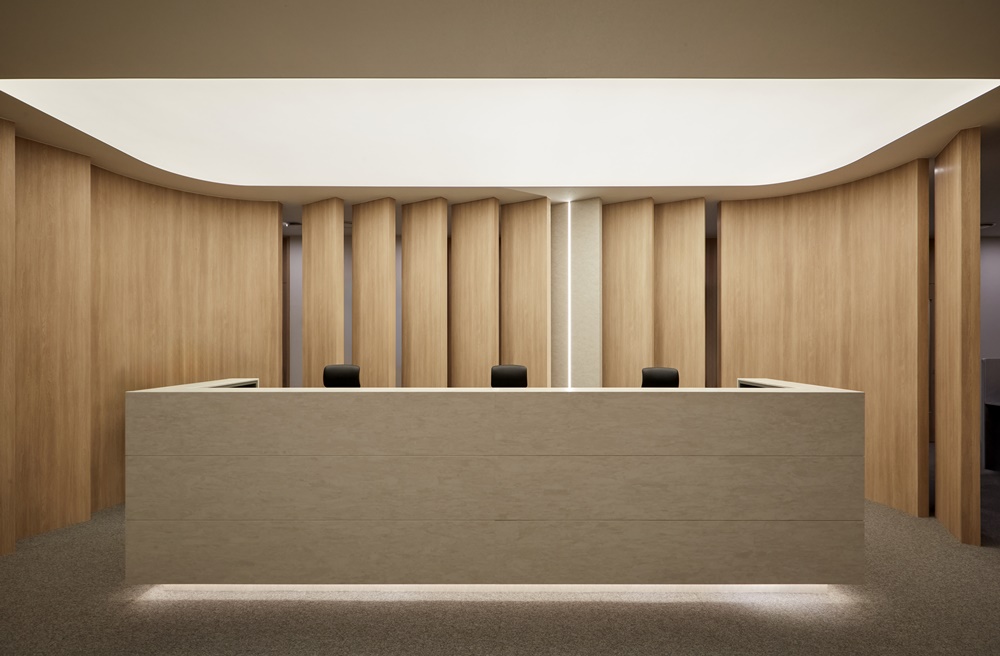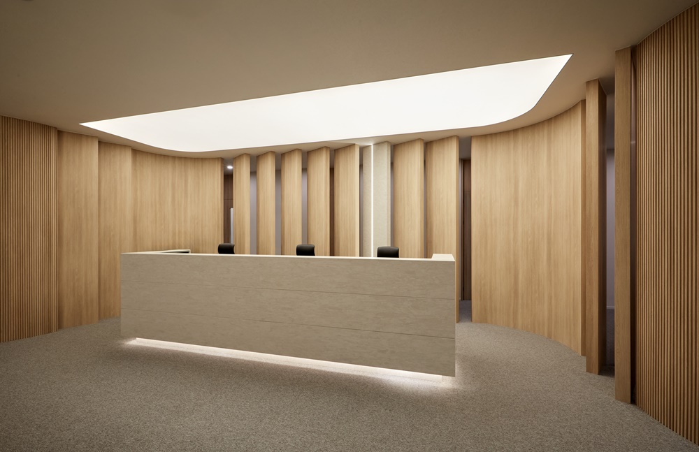 먼저, 로비는 수직적인 목재 루버 디자인을 활용해 층고가 높아 보이는 효과와 함께 권위 있고 정돈된 느낌을 연출했습니다.