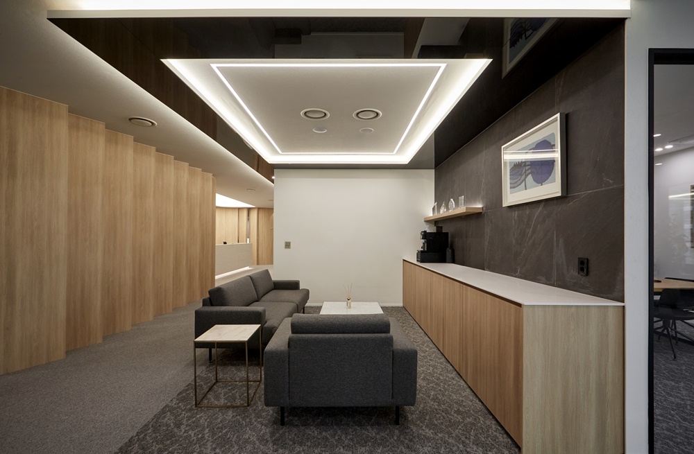 가구는 편안한 패브릭 소파와 대리석 텍스처 테이블, 그리고 깔끔하게 매립된 탕비 수납장을 배치하여 의뢰인게 최상의 편의를 제공하고자 했습니다.