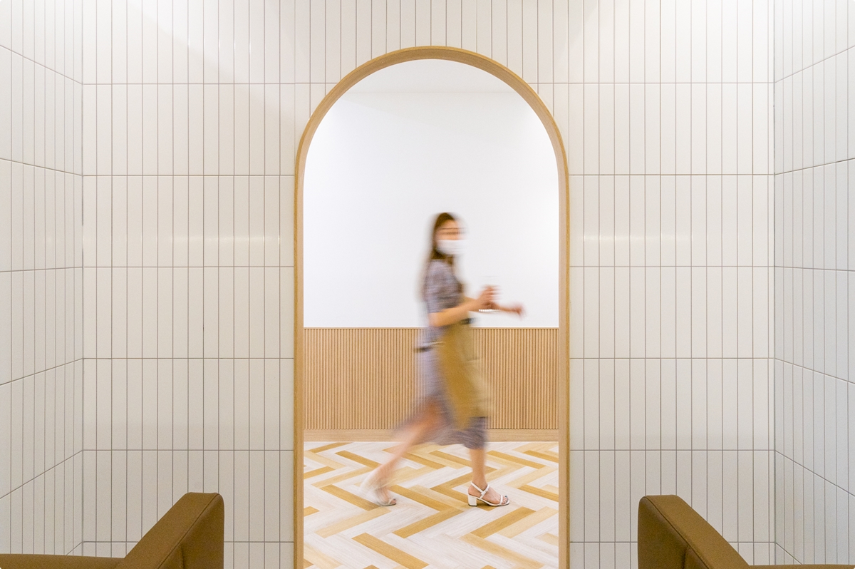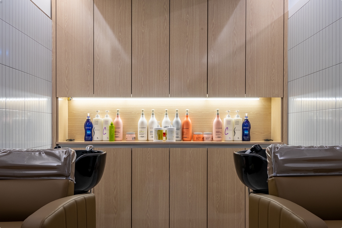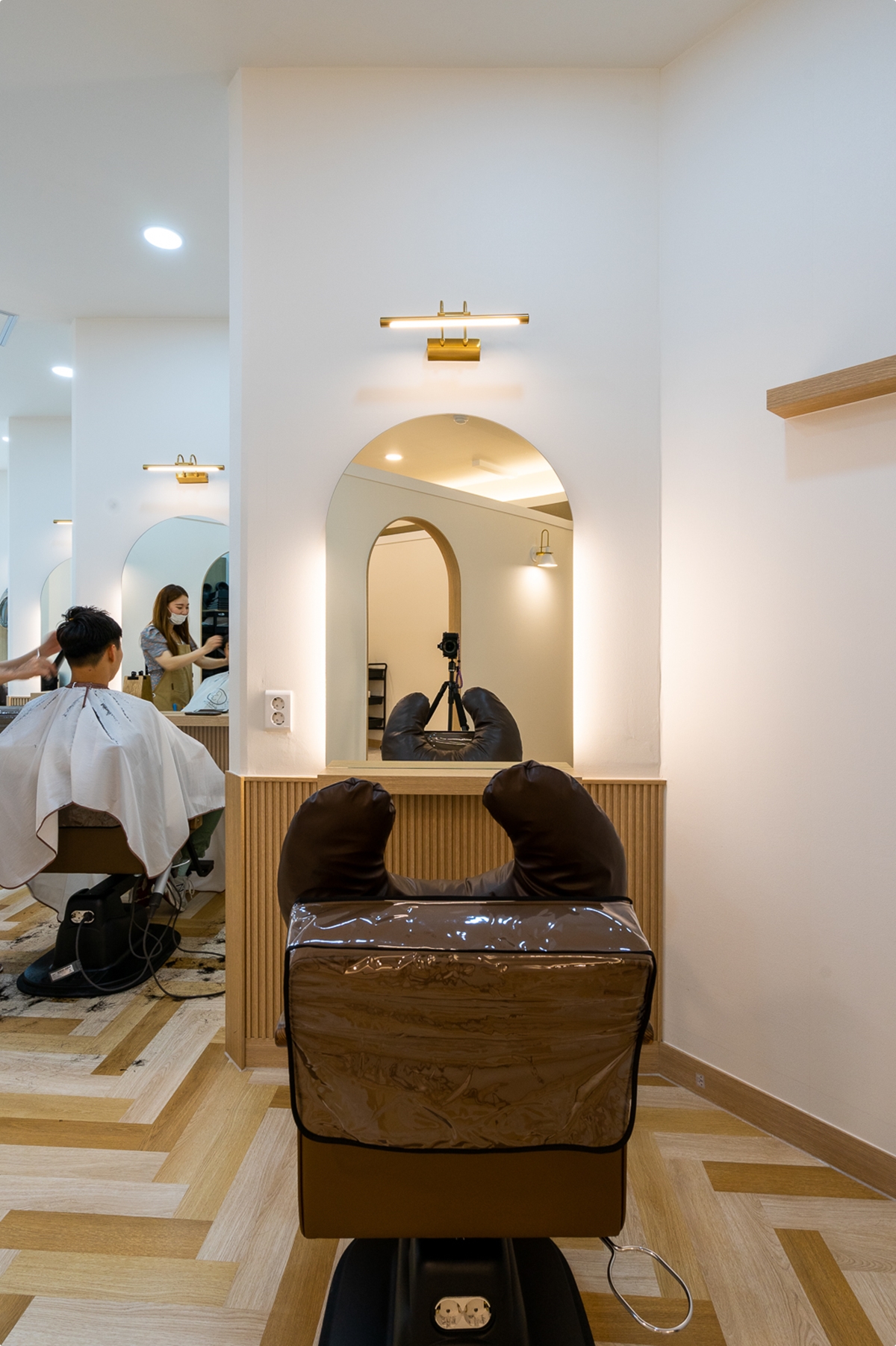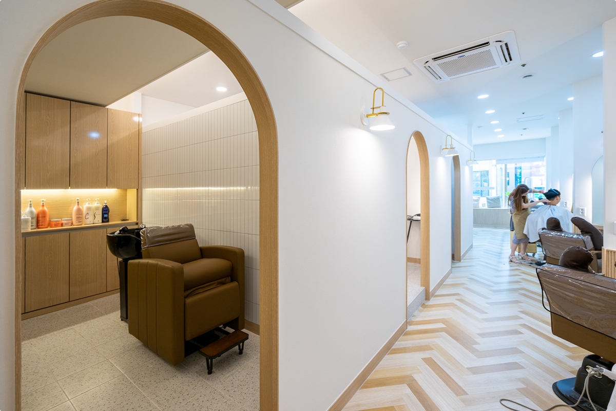 샴푸실 공간 피부관리실 공간의 룸을 오픈형으로 별도로 구성을 하였습니다. 개방형 라운드 도어 디자인을 채택 하였습니다.