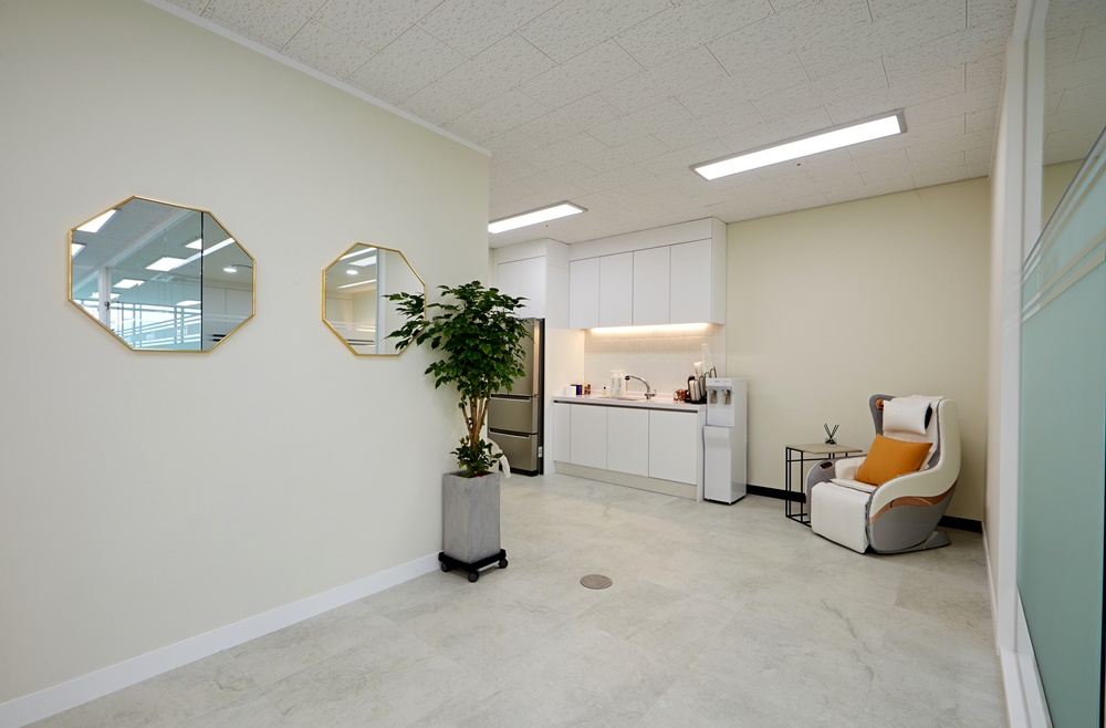 카페 스타일의 휴게존으로 안마의자를 두고 음료나 커피를 제공하는 공간을 마련했죠.