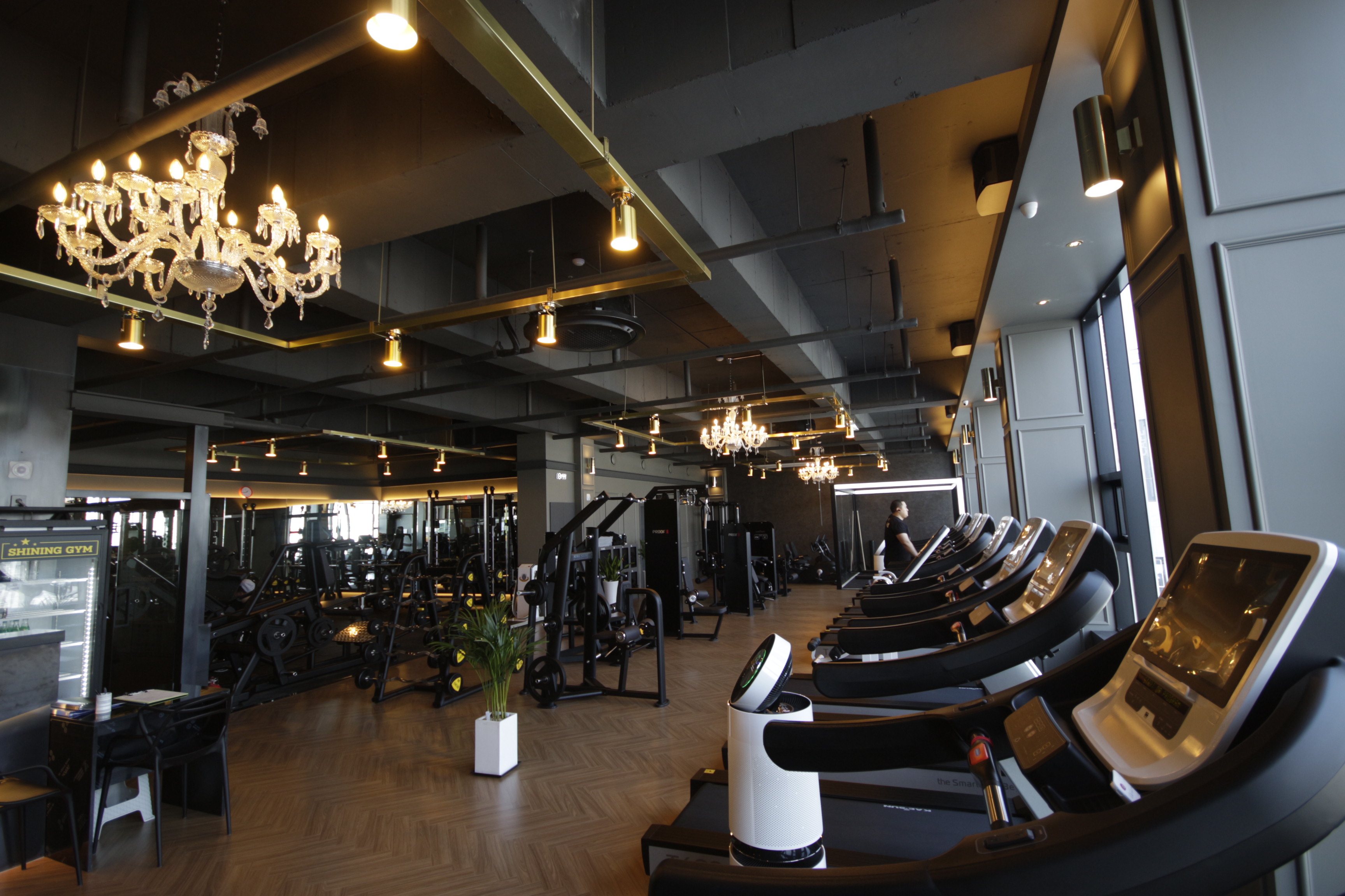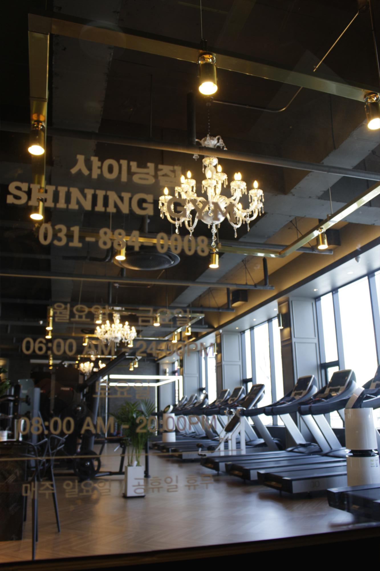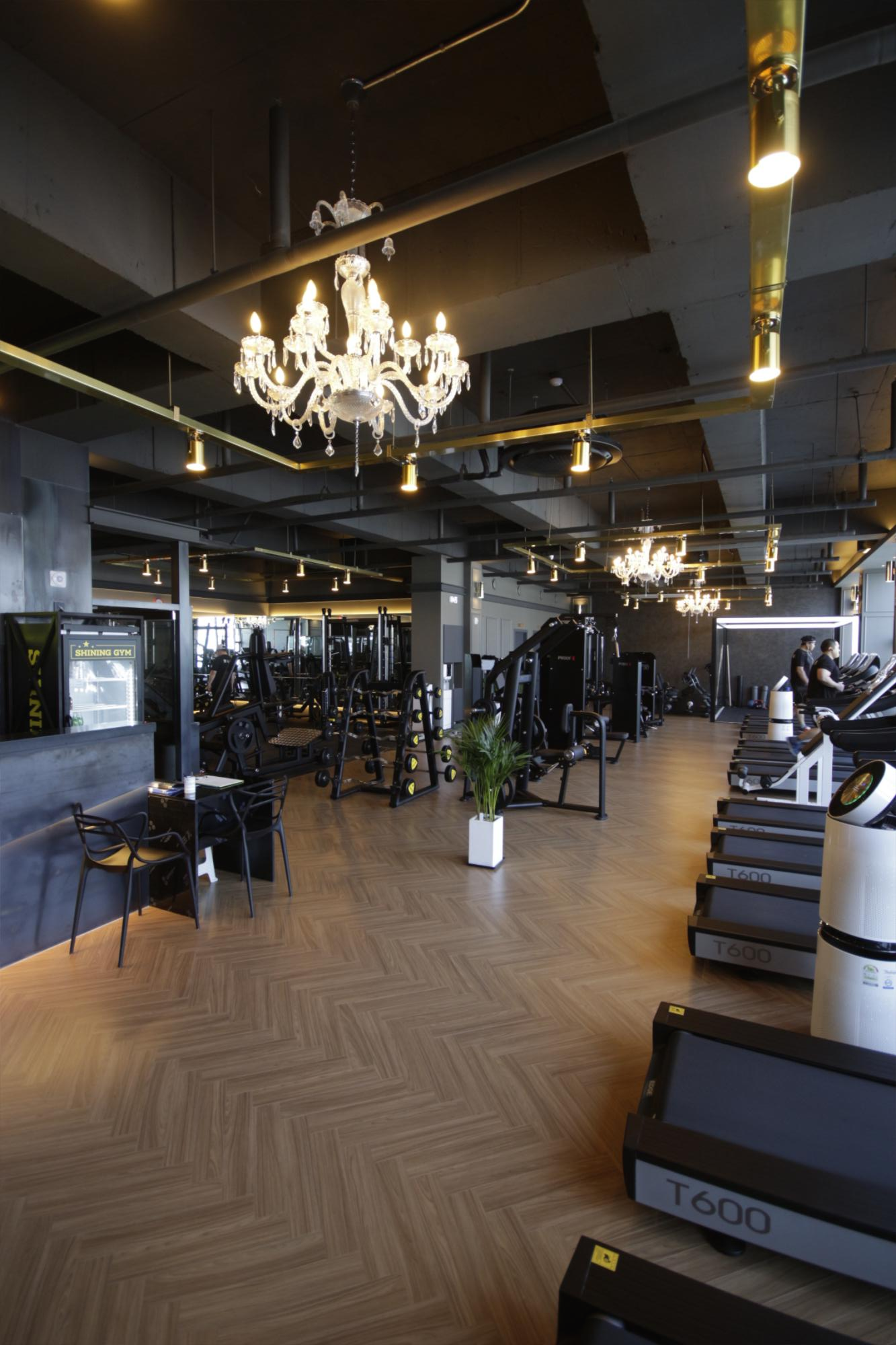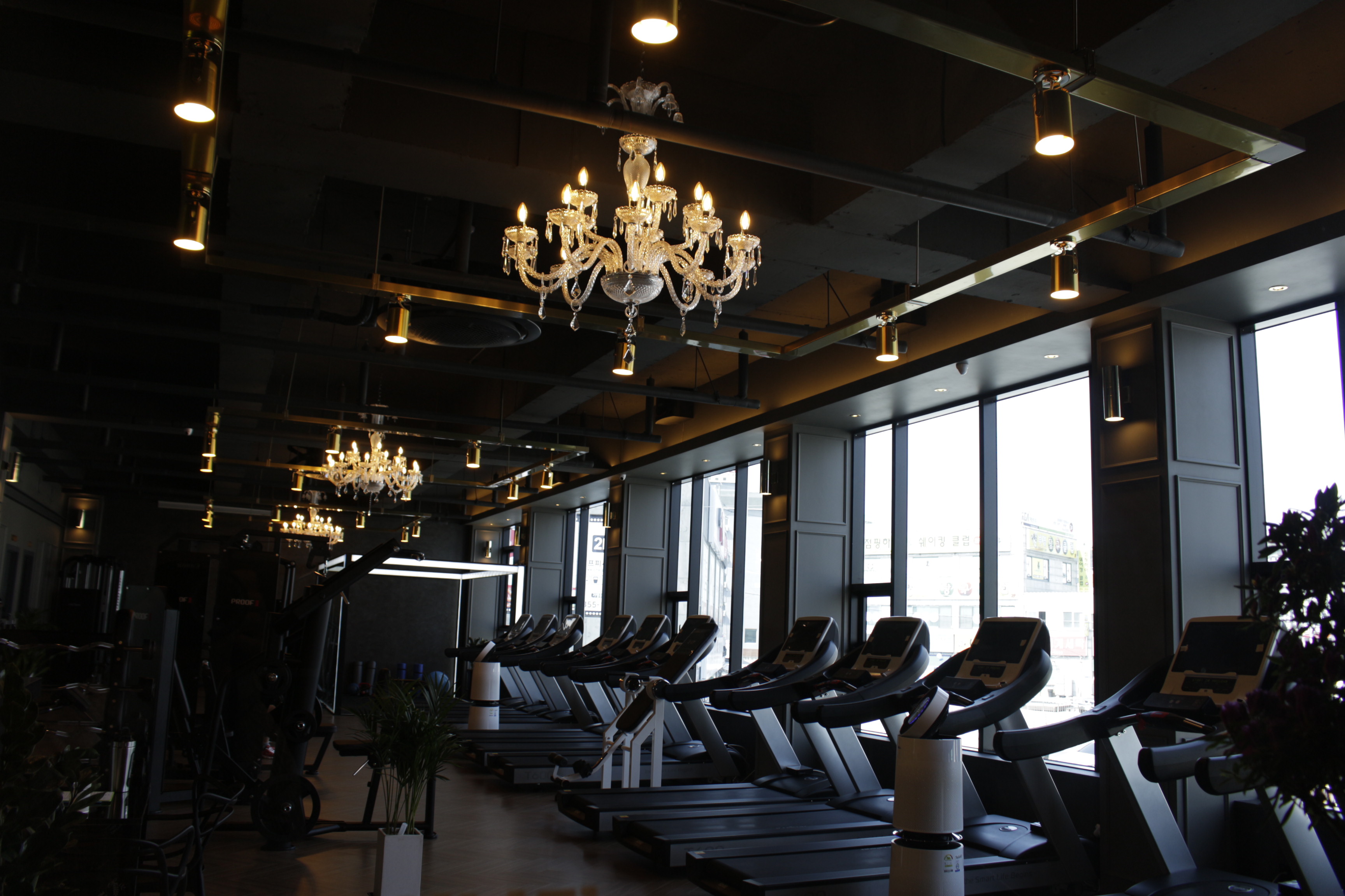 이 공간에서 다들 운동을 하고싶어서 줄을 선다는 소문이 ㅎ 런닝머신 전경 이구요 바닥은 헤링본 강화마루 마감입니다. 데코타일 보다 훨씬다 고가의 바닥 마감재이죠 사실 헬스장은 빈티지 바닥 마감이 유행이였지만 최근에는 이렇게 모던한 연출을 원하시는 클라이언트 분들이 많아 지는것 같습니다. 샹들리에 조명은 곳곳에 총 3 군데 설치 하였습니다. 이 헬스장인테리어의 포인트 중에 가장 중요한 디자인적인 요소가 아닐까 생각합니다.