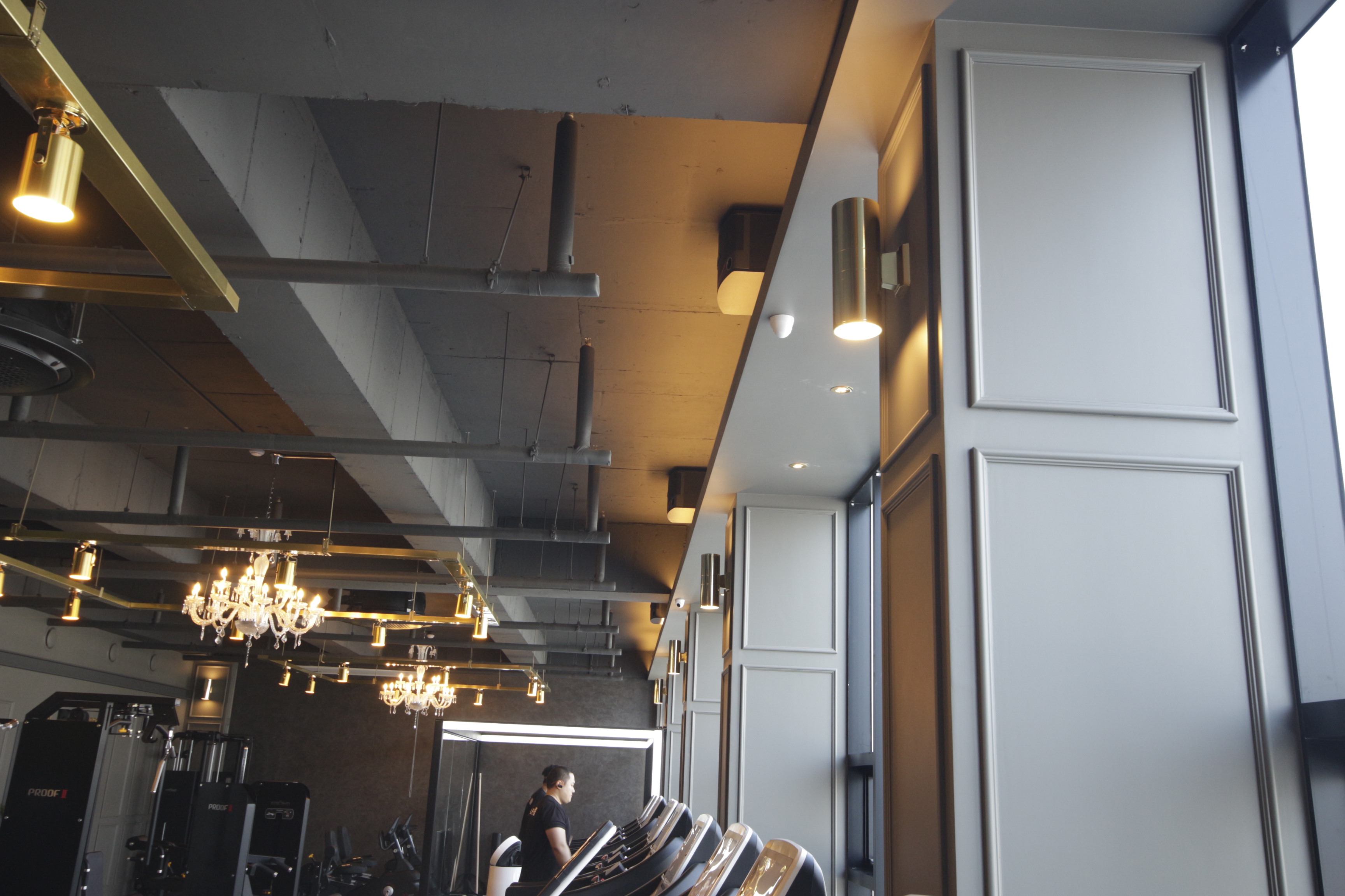 이 공간에서 다들 운동을 하고싶어서 줄을 선다는 소문이 ㅎ 런닝머신 전경 이구요 바닥은 헤링본 강화마루 마감입니다. 데코타일 보다 훨씬다 고가의 바닥 마감재이죠 사실 헬스장은 빈티지 바닥 마감이 유행이였지만 최근에는 이렇게 모던한 연출을 원하시는 클라이언트 분들이 많아 지는것 같습니다. 샹들리에 조명은 곳곳에 총 3 군데 설치 하였습니다. 이 헬스장인테리어의 포인트 중에 가장 중요한 디자인적인 요소가 아닐까 생각합니다.