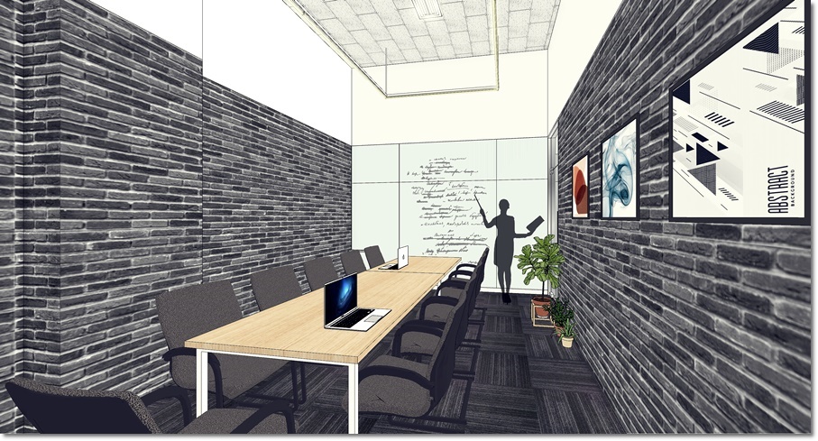 회의실 공간 디자인입니다. 공용 사무실과 통일성을 이루면서 회의실이라는 영역성을 부여하는 디자인을 제안드렸는데 고객님께서 다양한 분위기의 여러 시안을 원하셔서 모던 컨셉트, 빈티지 컨셉트를 작업해 제공해드렸습니다.