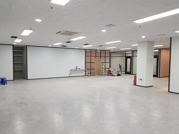 조명 시공 작업까지 끝내니 어느 정도 사무실의 모양이 갖춰지고 있네요. 조명은 사무실의 업무 효율과 상관있는 조도를 결정짓는 중요한 요소이기 때문에 레이아웃과 책상, 책장, 진열장 등의 가구 배치에 맞춰 시공을 해야하기 때문에 시공 전 디자인설계를 할 때 정확하게 구성하는 것이 중요합니다.
