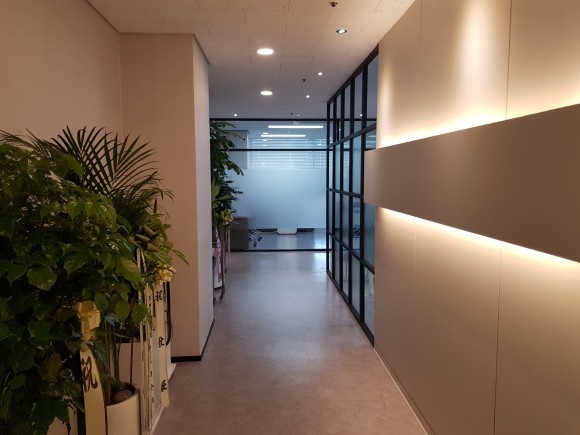사무실 내부 복도입니다. 벽면에 단차를 둔 디자인으로 시공하고 간접조명을 둬 외부 파사드의 은은함이 내부로까지 이어지도록 했고 전체 조명은 매입등으로 시공해 깔끔함을 강조했으며 사무 공간으로 들어가는 곳에는 철제 프레임의 유리 가벽을 설치해 다음 공간에 대한 호기심이 발생할 수 있도록 의도했습니다.