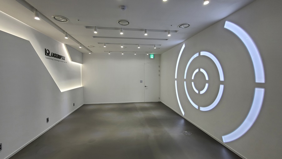 홍보 및 전시를 할 수 있는 쇼룸입니다. 화이트 벽면과 그레이 바닥의 대비로 깔끔함을 강조했고 양 벽면에 멋진 디자인 덕분에 첨단의 미래지향적인 느낌이 강한 공간입니다. 천장에 레일 조명을 시공해 위치와 각도를 조절할 수 있도록 함으로써 쇼룸을 다양하게 활용할 수 있도록 했습니다.