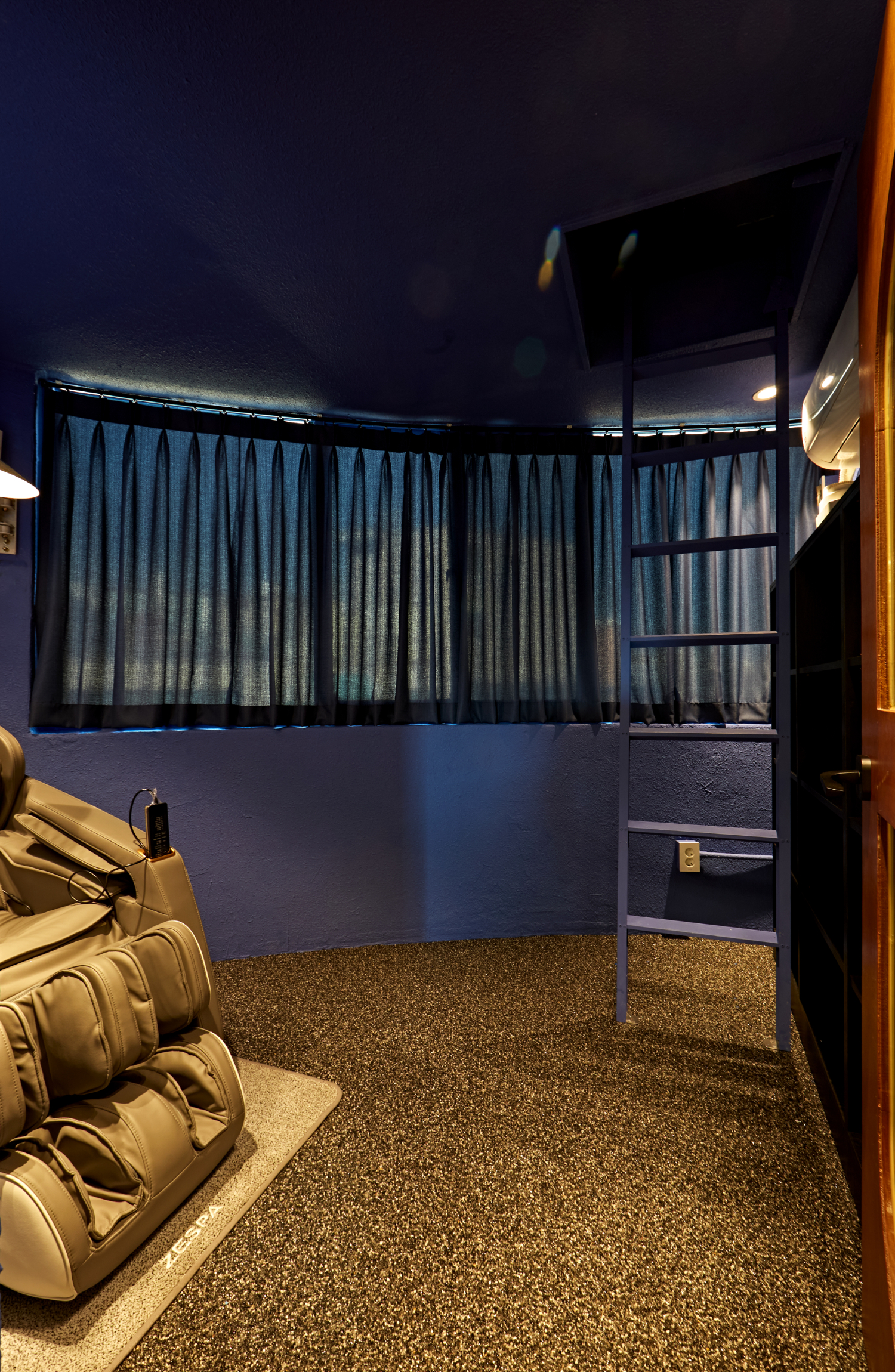 사무실 한 쪽에 있는 비밀공간 같은 곳은 네이비 컬러로 도장하여 차분한 느낌을 주었는데요. 마치 강남 논현동 사무실인테리어 30평 공간의 숨겨진 아지트같은 곳이었습니다. 직원들이 편안하게 휴식을 취할 수 있도록 배려한 색감이었고 안마의자는 물론 도서공간도 마련되어 있었습니다.