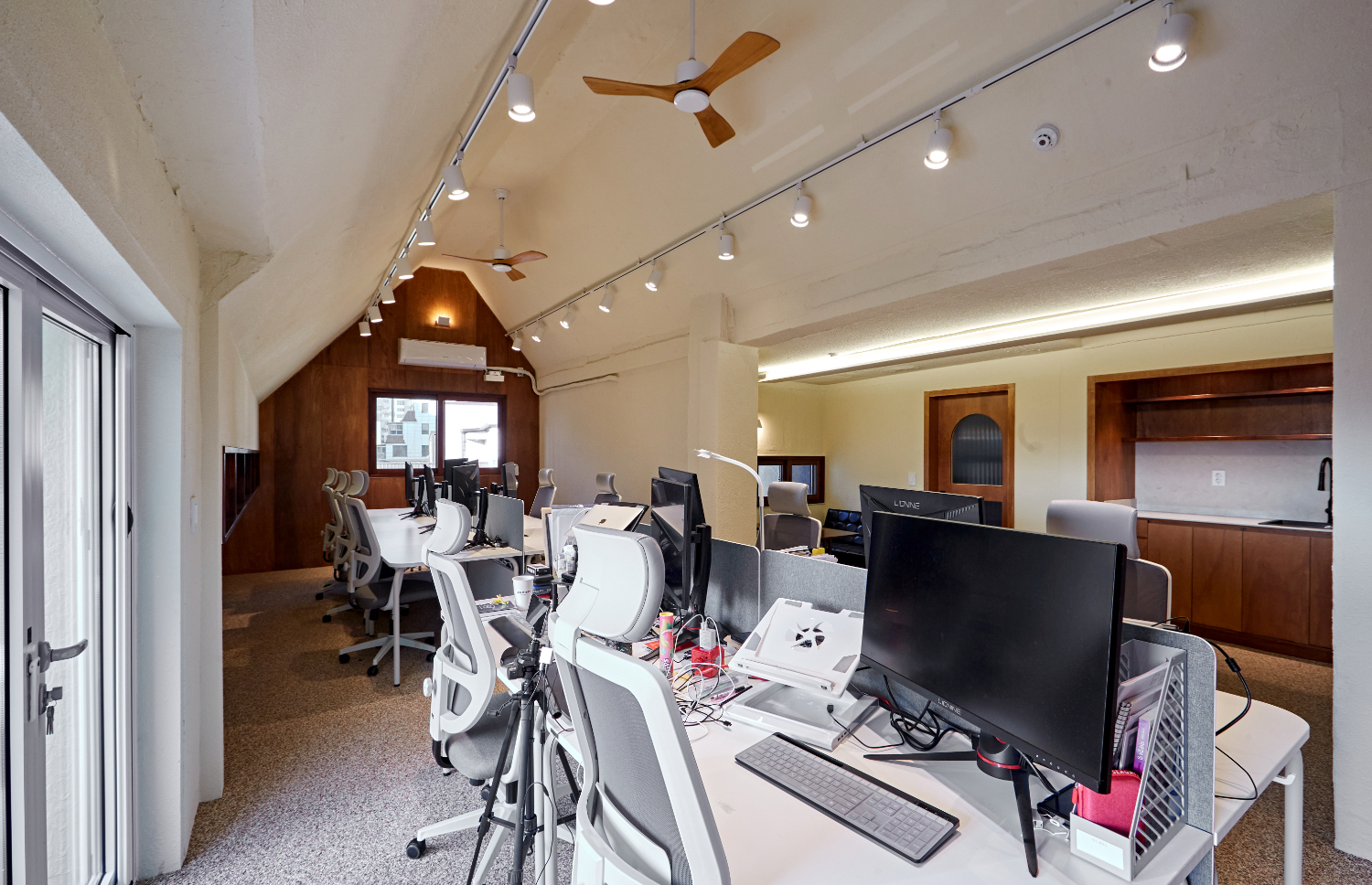 메인 오피스 공간의 천장에는 2열로 이뤄진 레일 조명 사이에 실링팬을 설치하였는데요. 실링팬은 공기 정화의 효과도 있으면서 그 자체로 인테리어 오브제 역할을 해주기도 합니다.