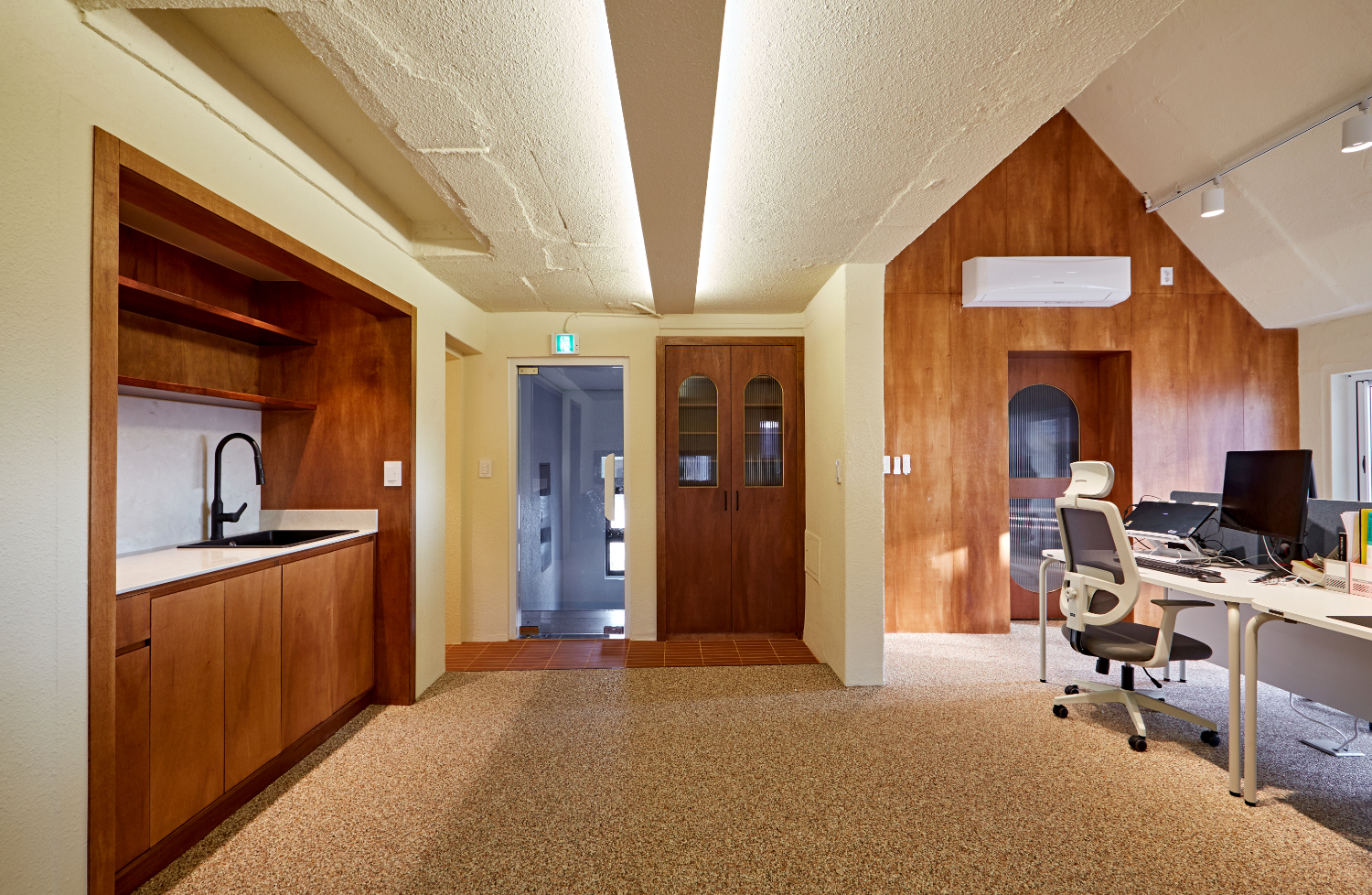 오피스공간은 마치 유럽 마을의 한적한 시골 오두막같은 아늑한 분위기를 띄며, 메인등이 없이 간접등으로 은은한 분위기를 연출하였습니다. 그리고 벽면의 우드와 바닥의 따뜻한 색감이 서로 조화를 이루며 다락방같은 천장의 구조도 그 무드를 더합니다.