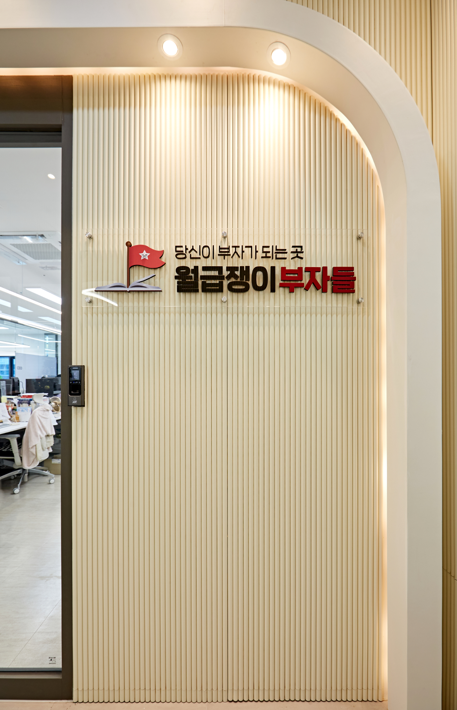 벽면에는 센스있는 사인물 디자인으로 포인트를 주었습니다. 기업 로고는 골드 컬러로 고급스럽고 세련되게 만들었으며, 측면에는 화이트 컬러의 사인물로 전체적으로 부담 없이 심플하게 마무리 했습니다.