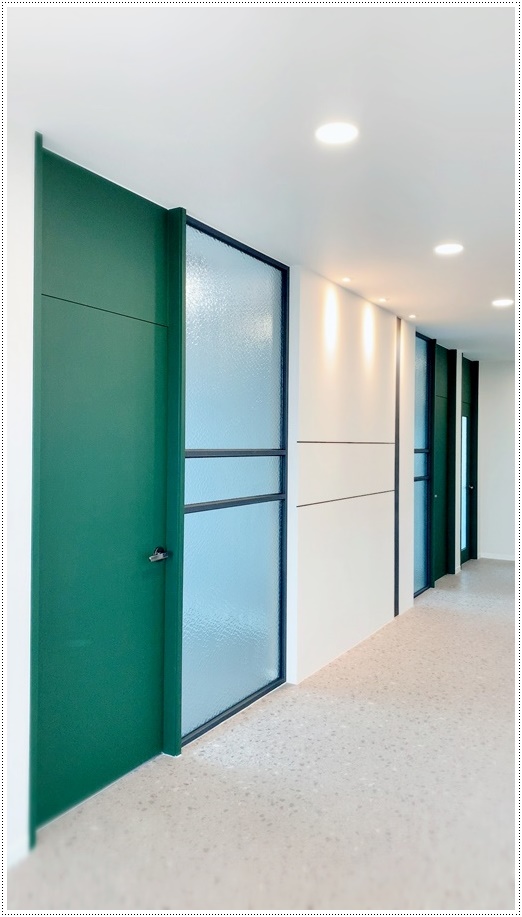부서가 다른 영역의 사무실입니다. 전체적으로 화이트 & 그레이톤으로 통일성을 유지했고 블랙 컬러를 적용해 영역성을 명확히 했습니다. 목공 가벽으로 공간을 분리하고 복도에서 사무실로 들어오는 문은 유리 자동문을 시공하고 사무실과 사무실을 연결하는 문은 타공 도어를 시공해 차별성을 주었습니다. 전체적으로 매입형 조명을 시공해 깔끔하고 높은 층고를 유지하도록 했고 창문으로 들어오는 자연채광을 충분히 활용해 밝고 쾌적한 환경을 유지하도록 했죠.