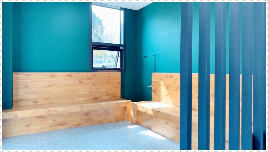 공용 로비에 구성한 휴게공간입니다. 간살 파티션을 시공해 공간을 만들었고 목공 가벽 대신 간살을 적용해 개방감을 주면서 시선을 분산시킬 수 있도록 했습니다. 엘리베이터에 적용한 템바보드의 블루 컬러를 휴게공간에도 적용해 통일성을 주었고 같은 공간으로 인지할 수 있도록 했는데요, 내부에도 함께 적용해 깔끔하게 연출했습니다. 벽면을 시원한 블루 컬러로 마감하고 우드톤 벤치를 벽면에 시공해 내추럴하고 편안한 분위기에서 쉴 수 있도록 했습니다.