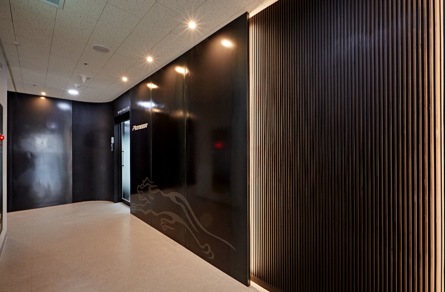 내부로 들어서면 처음 마주하는 아트월이 외부와 동일한 형식의 템바보드로 되어 있어 통일감을 주고 있습니다.