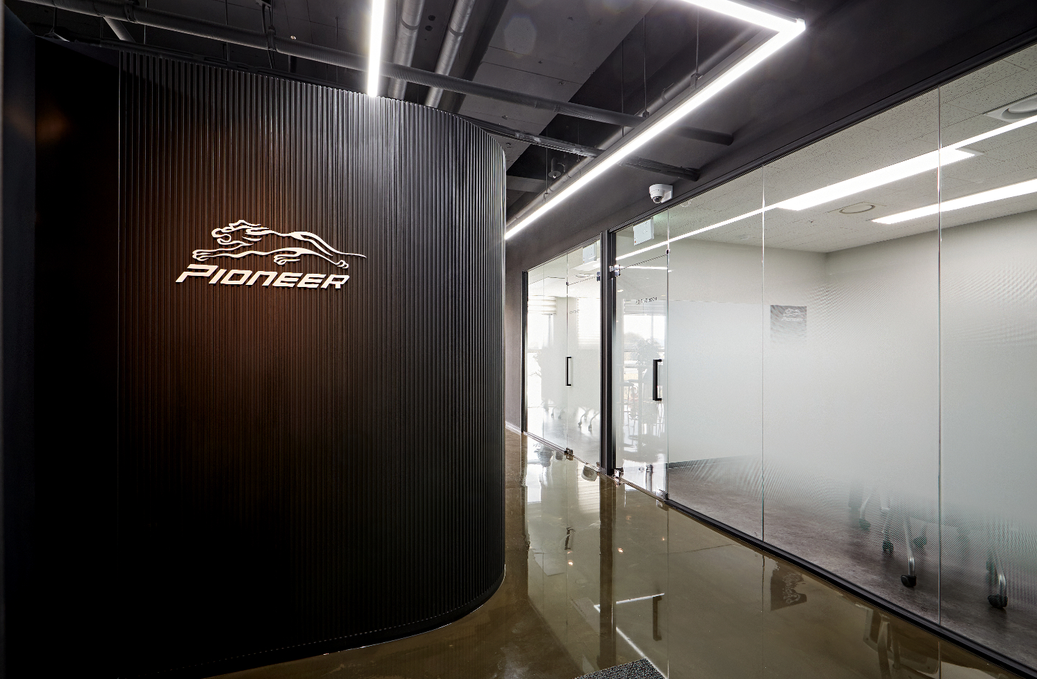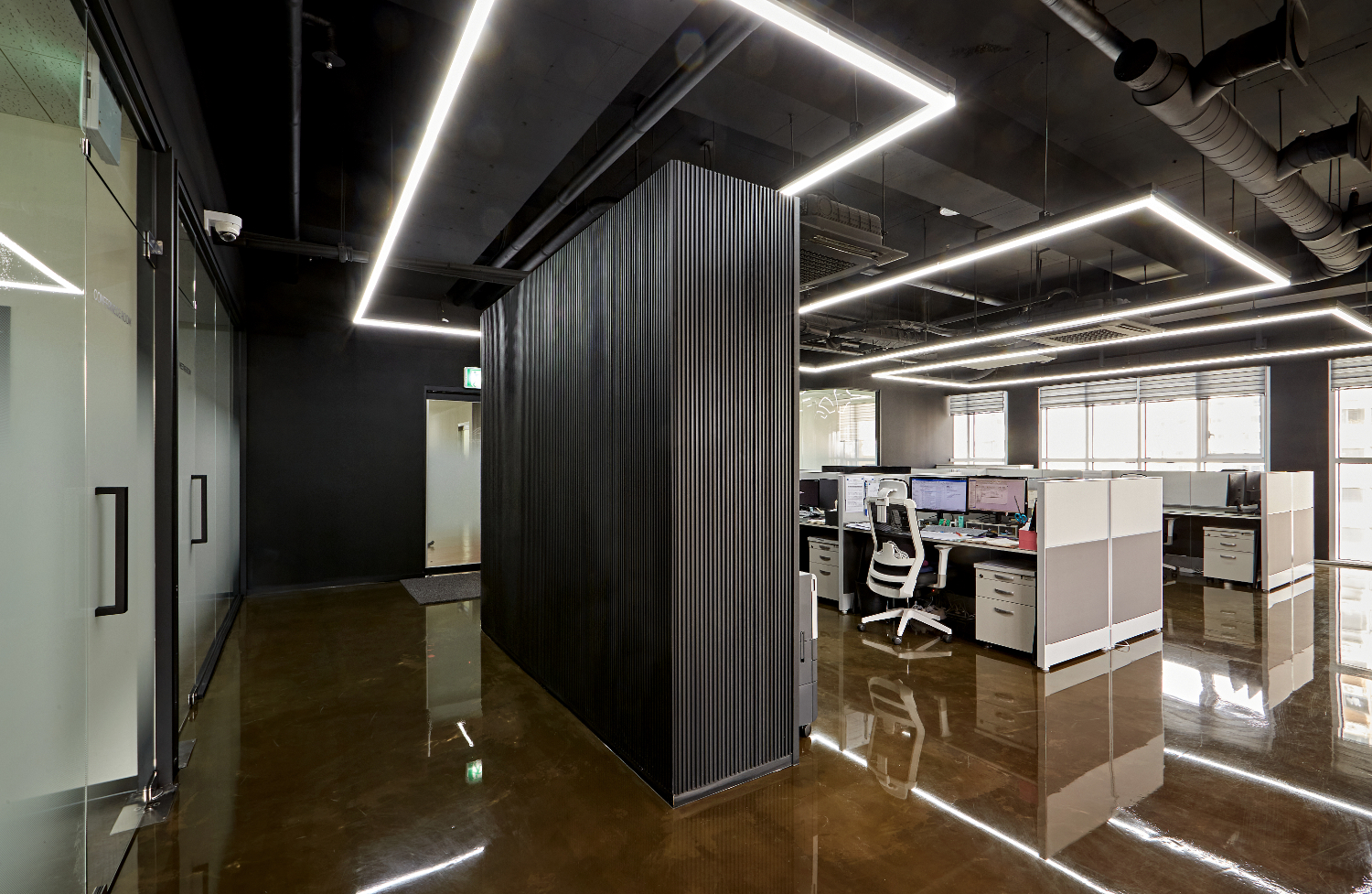 템바보드 파사드는 메인 사무공간과 별도의 룸으로 마련되어 있는 회의실과 같은 공간을 분리하는 역할을 해주고 있습니다. 그리고 천장은 노출 시공하여서 색다른 분위기를 만들면서 대형 라인 조명으로 일반 사무실이 아닌 상업공간 같은 매력을 더해주었습니다.