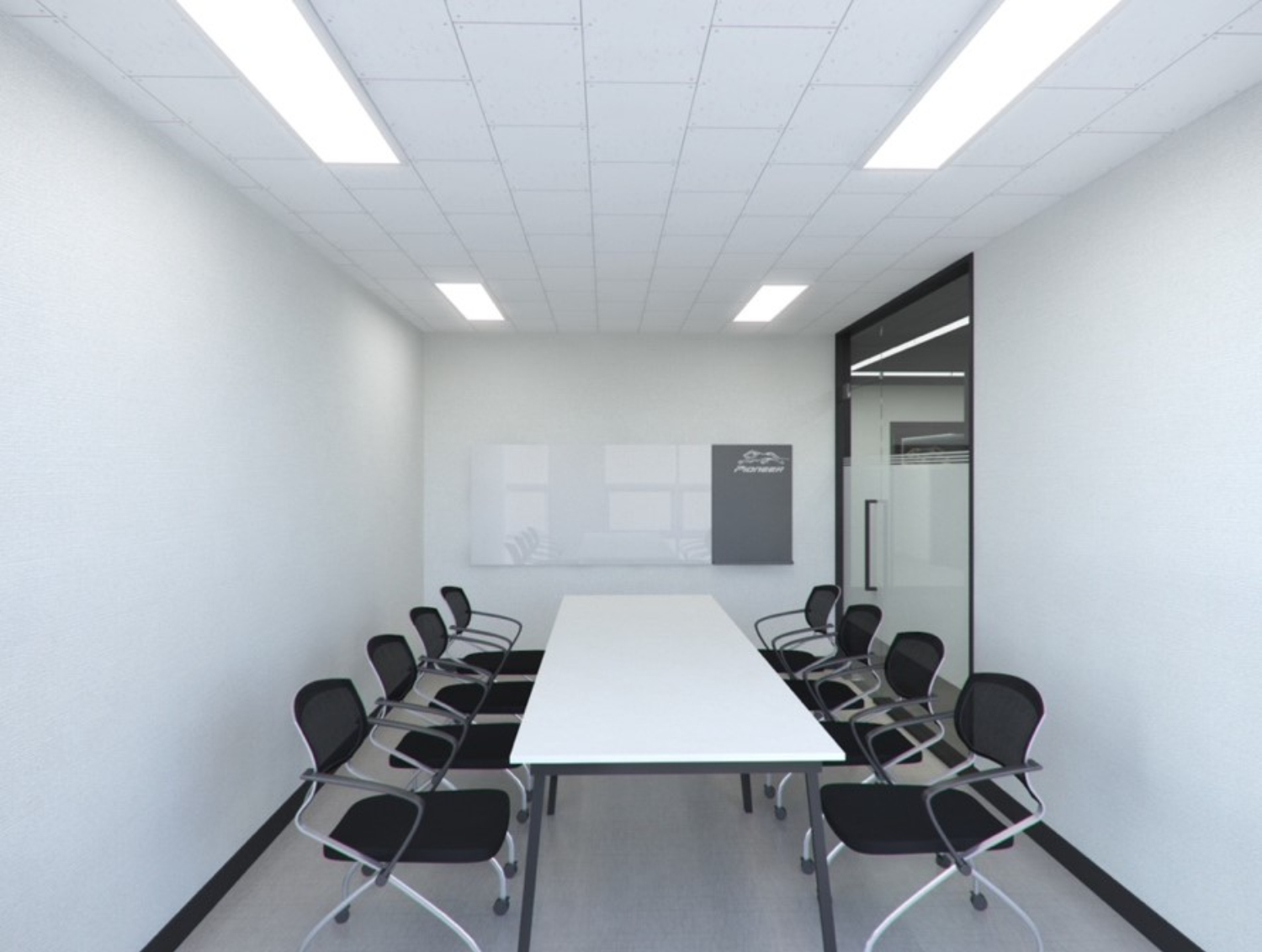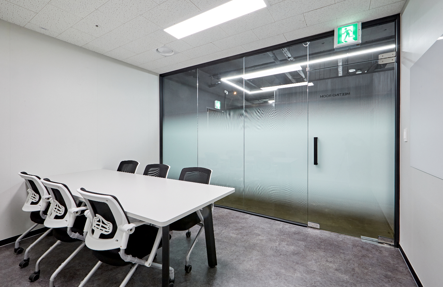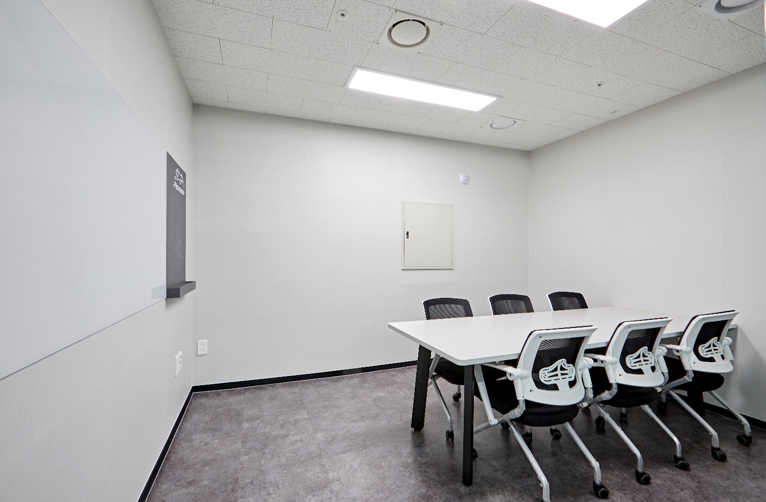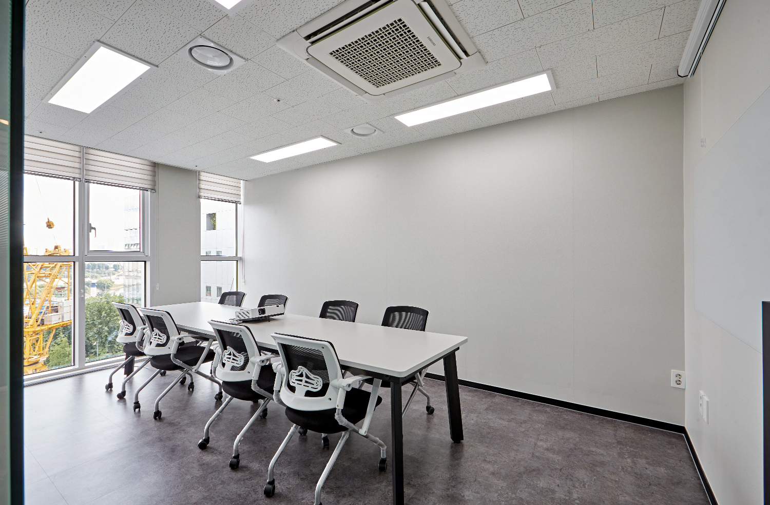 미팅룸은 긴 테이블로 다수의 인원이 앉을 수 있도록 하였으며 전면에 빔프로젝트를 활용했습니다. 미니멀 디자인을 추구하는 클라이언트분의 성향에 맞추어서 전체 벽은 화이트로 시공하였습니다.