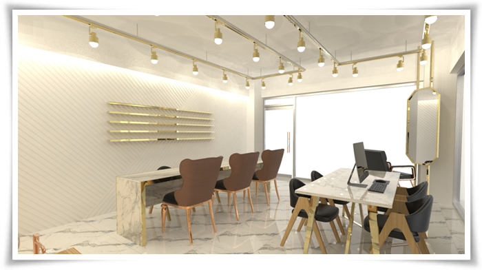 상담데스크 같은 경우에는 뒤에 유리 외벽을 설치함으로서 외부와의 전경이 조금 더 잘 보이고 개방성을 느낄 수 있도록 디자인을 하였으며 작업데스크의 외벽으로는 사선 무늬의 베이지톤 벽지 가운데에 진열장을 둠으로서 고객의 시선이 네일을 받고 있는 본인의 손톱에만 가는 것이 아닌 작업자 뒤에 있는 외벽으로도 갈 수 있도록 배치해보았습니다.