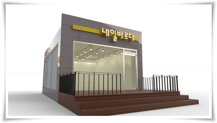 네일샵의 출입구 전경입니다. 내부와는 다르게 그레이톤을 이용해서 가게 외부의 전체적인 전경을 디자인해보았습니다. 간판 같은 경우에는 무채색인 그레이톤 사이에서 옐로우톤을 넣어서 상대적으로 눈에 띄게 만들었으며 네일샵의 기업 로고를 넣어서 지나가던 고객들이 한층 더 편하게 네일샵을 알아보고 방문할 수 있도록 인테리어 디자인을 시도해보았습니다.