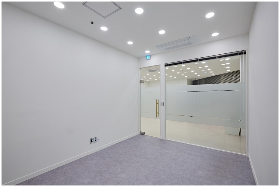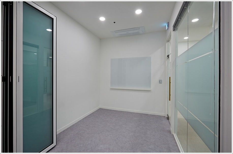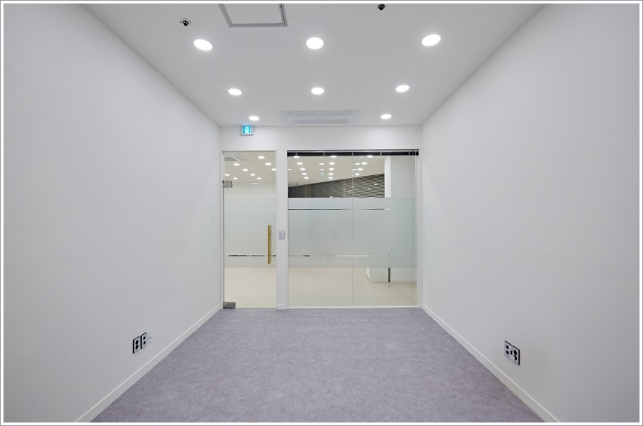 개별 사무실은 합판과 유리로 가벽을 세워 독립적인 공간으로 만들었고 글래스 중앙에는 불투명 시트지를 시공해 프라이버시를 확보했으며 바닥 마감은 오픈형 사무공간과 달리해 영역성을 명확히 함으로써 가독성을 높였습니다. 공용 공간에서 진입하면 반대편의 개별 공간으로 나갈 수 있도록 2개의 문을 시공했는데요, 반대편쪽 문은 슬라이딩 도어를 적용해 동선에 간섭되지 않도록 했습니다.