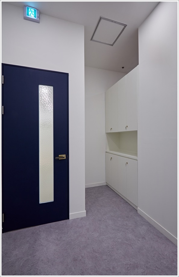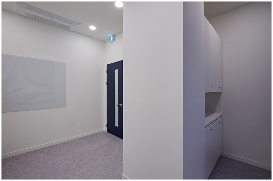 대표실 공간은 네이비 컬러를 적용해 누가봐도 대표실인 것을 알 수 있도록 했고 기둥과 벽 사이에 수납장을 제작 시공해 다양하게 사용할 수 있도록 했습니다.