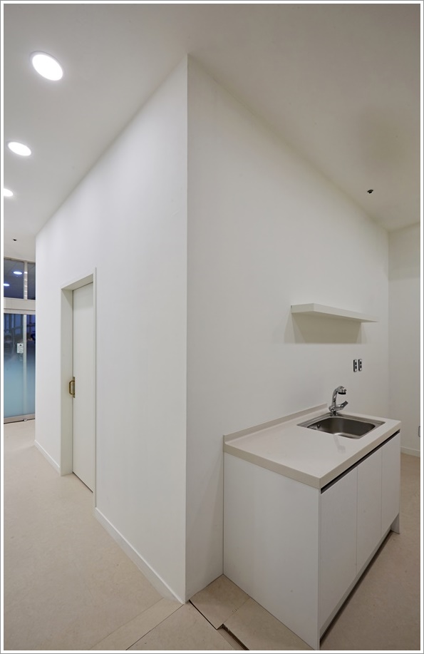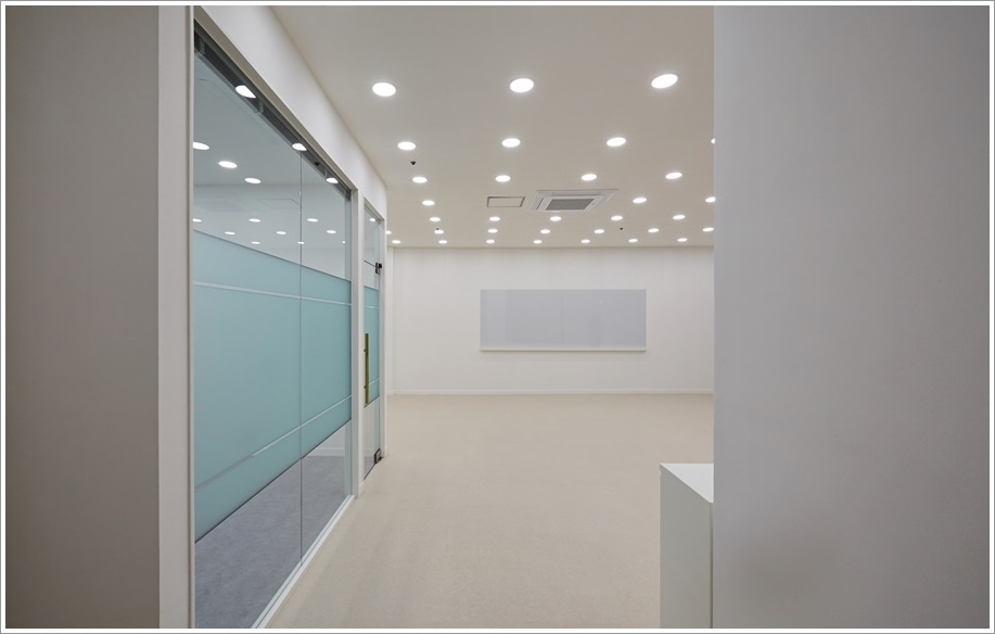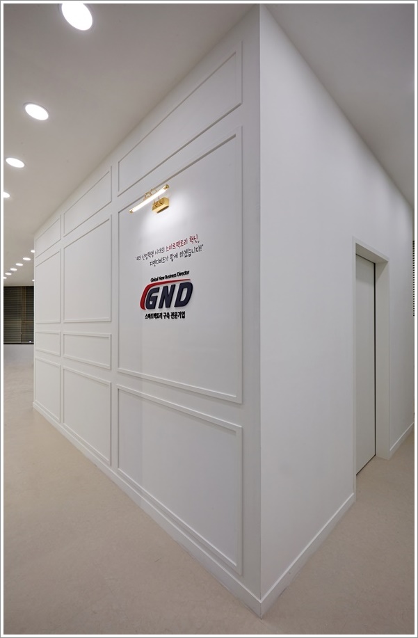 내부 파사드는 웨인스코팅이 시공된 화이트를 적용했고 회사명과 로고를 아크릴로 제작해 부착하고 시트지 커팅으로 회사의 비전을 시공했으며 벽부 조명으로 강조해 회사 정체성을 느낄 수 있도록 했습니다. 내부 파사드를 중심으로 오른쪽에 대표실 및 회의실을 배치했고 왼쪽에 공용 사무공간을 배치했으며 뒷편에 휴게공간을 배치해 동선을 구분함으로써 자유롭고 편리하게 사용할 수 있도록 배려했습니다.