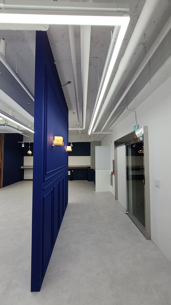 사무실 내부 파사드입니다. 네이비 컬러로 내부 이미지월을 세웠으며 웨인스코팅으로 마무리하고 벽부등을 시공해 고급스러움을 한껏 끌어올렸습니다. 시공 후 안전성을 확보하기 위해 바닥과 천장에 반영구적으로 고정을 시켰고 천장에서 배선을 따 조명을 시공함으로써 깔끔하게 마무리될 수 있었습니다. 전체적으로 노출 천장을 그대로 활용해 독특한 조명 연출을 완성할 수 있었는데요,