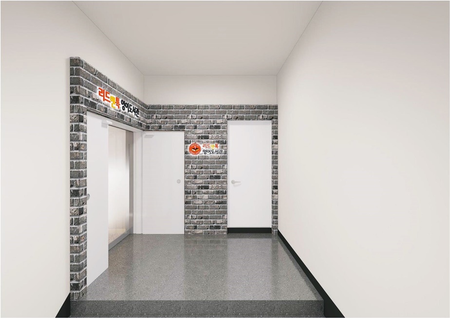 벽면은 격자 무늬를 적용해 입체적으로 연출했는데요, 차후에는 블록별로 공고사항을 게시하거나 영어 관련 교육자료 등을 게시할 수 있습니다.