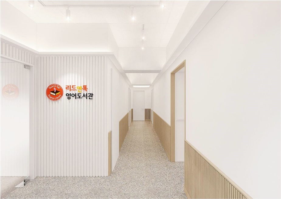 내부 파사드입니다. 로비에는 템바보드를 적용한 아트월과 컬러 사인물을 적용해 깔끔하면서 경쾌한 느낌을 줬습니다. 교실로 진입하는 복도 역시 화이트를 적용했고 하단부에는 우드 템바보드를 조화하니 전체적인 밸런스가 생기면서 아늑하고 안정감이 느껴지네요. 복도의 특성상 좁고 답답할 수 있지만 노출천장, 화이트우드 벽면을 적용하니 팽창되고 화사해 넓어 보이는 효과가 있습니다.