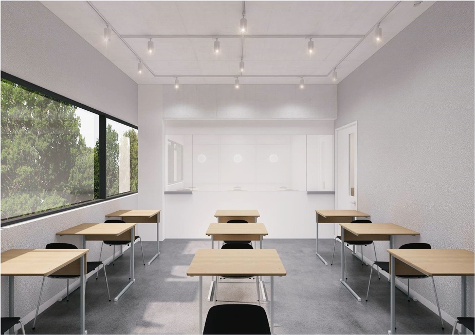 물론, 각 공간에 필요한 조명, 소방설비, 전기, 공조기 등의 설계도 사용하기 편리하게 정해서 적용을 했고요, 교육시설의 법령에 따른 면적도 지켰습니다.