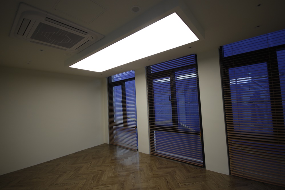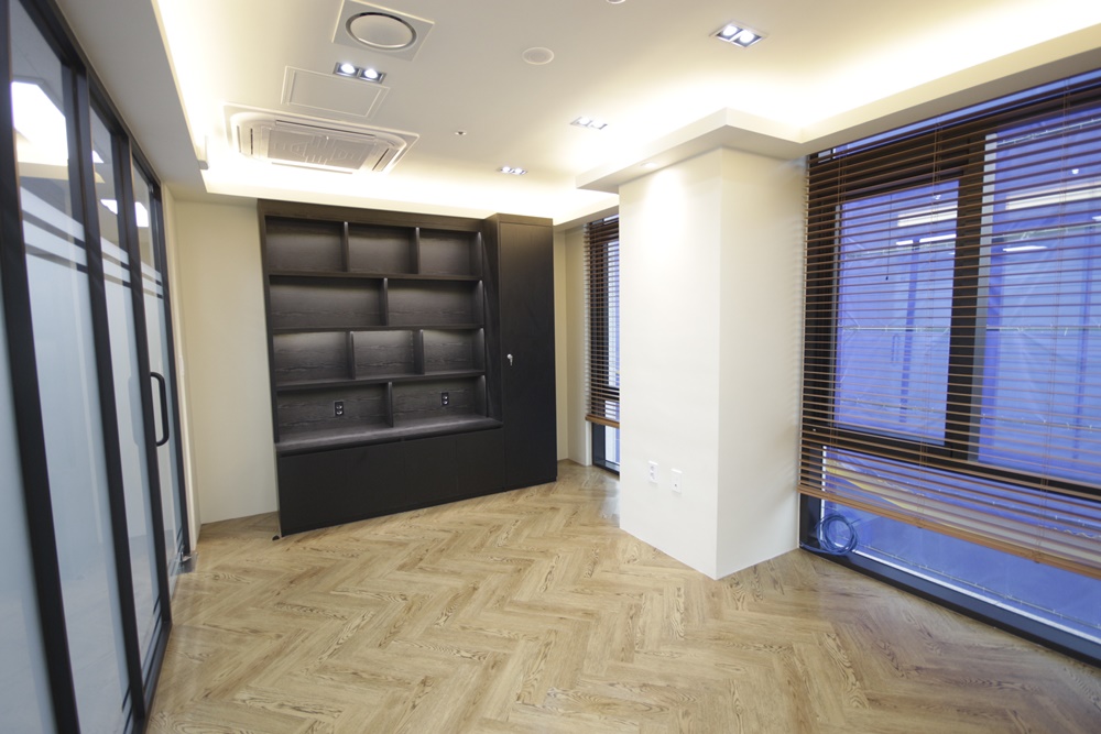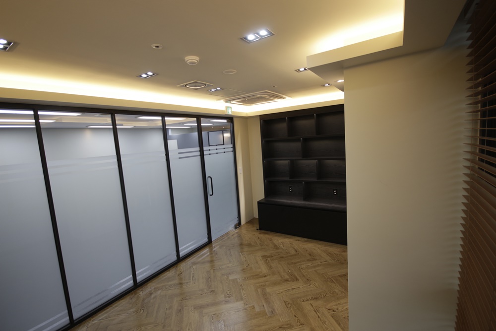 대표실 공간입니다. 아이보리 벽면과 헤링본 패턴의 우드톤 바닥을 적용해 아늑한 공간으로 시공했고 불투명 시트지를 시공한 유리와 블랙 프레임으로 구성된 가벽을 세워 독립성과 개방성을 모두 확보했습니다. 조명은 천장 매입등을 시공하고 천장 테두리를 따라 단차를 활용한 간접등을 설치해 은은하면서 깔끔하게 연출했습니다.
