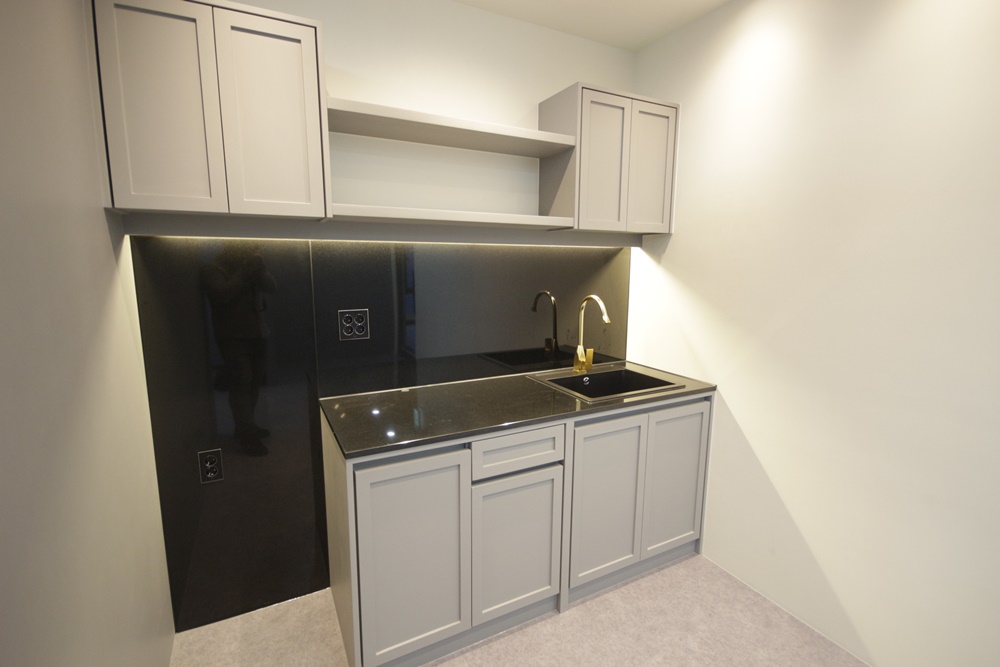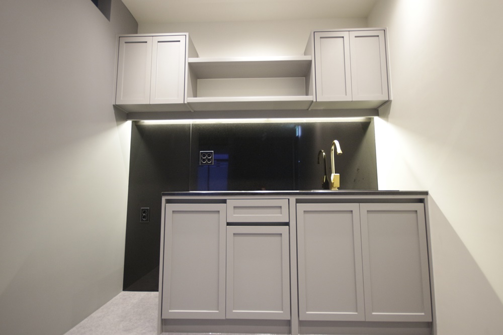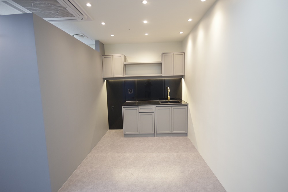 탕비 및 휴게 공간에는 상부장, 하부장, 개수대를 설치해 다양한 수납, 차 끓이기, 세척 등이 가능하도록 했습니다. 양 벽면은 화이트와 그레이로 마감하고 밝은 그레이 데코 타일로 바닥을 마무리 했으며 천장에 매입등을 시공해 깔끔한 분위기를 연출했습니다.