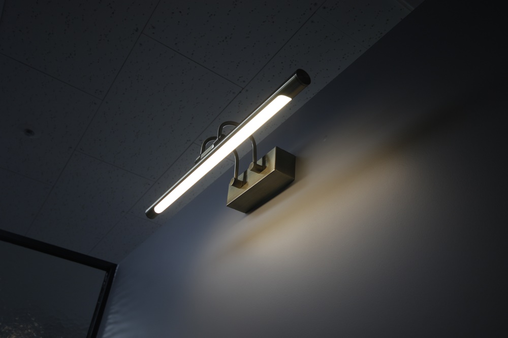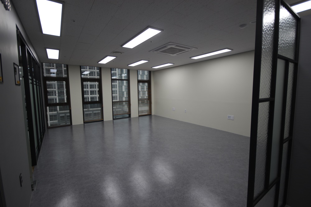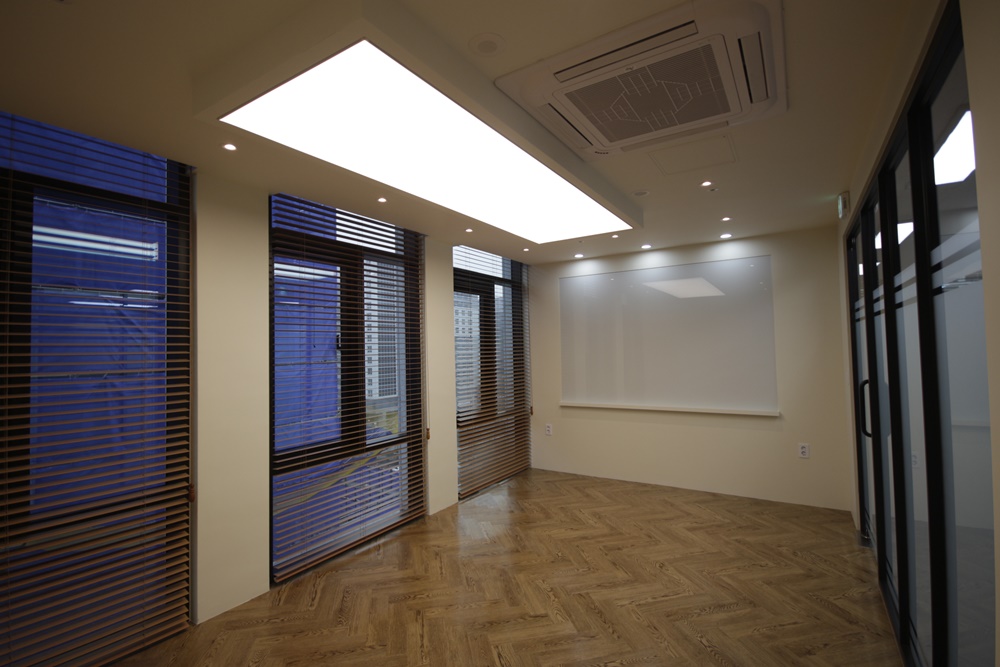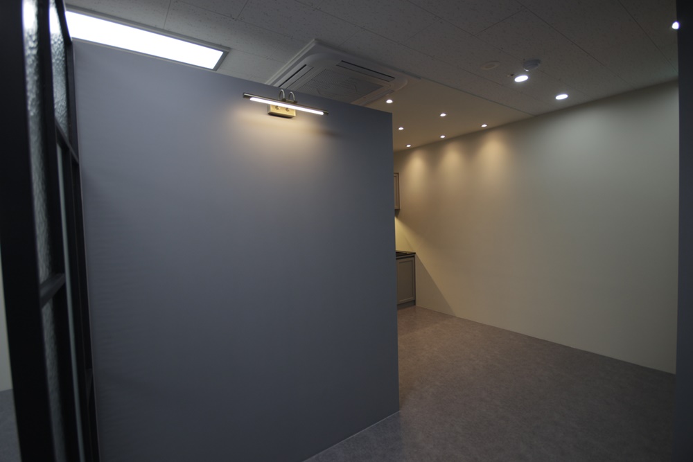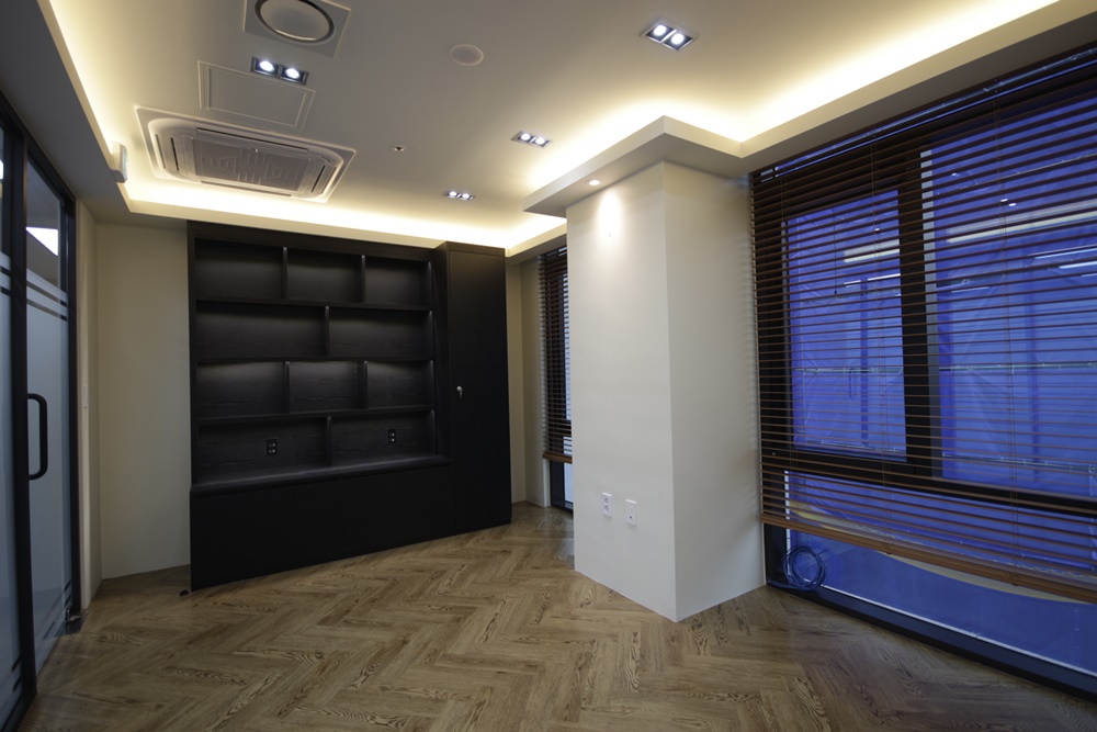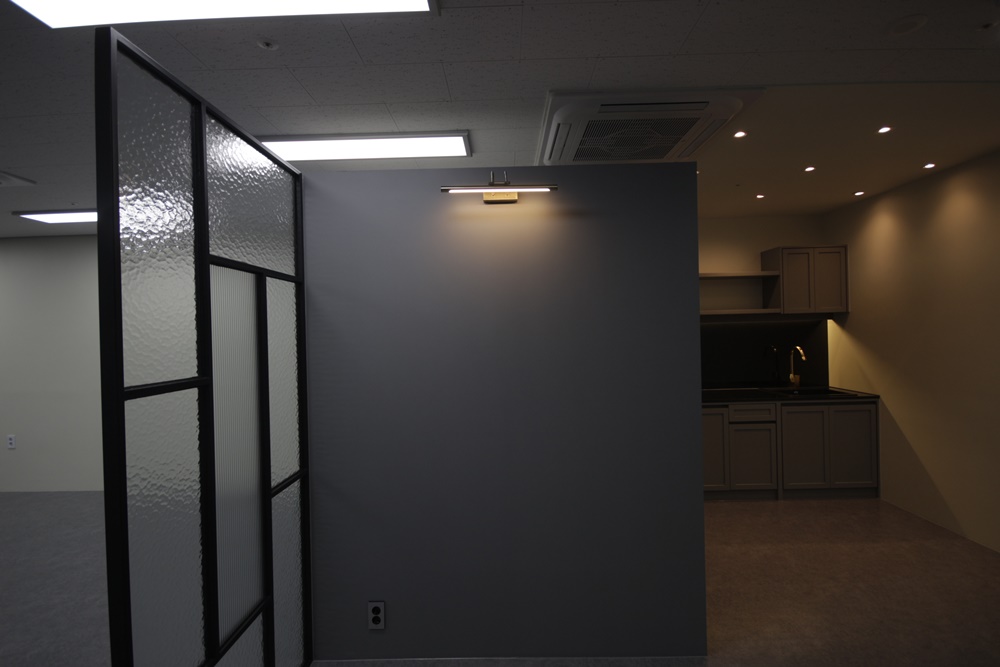 가벽으로 사용되는 벽면은 그레이 컬러로 마감하고 맞은편 벽면은 아이보리 컬러로 마감해 공간성을 부여했으며 바닥은 블랙 프레임과 잘 어울리는 그레이로 마감해 가벽과 컬러를 통일했습니다. 조명은 매입형 형광등을 적용해 최대한 밝고 화사하게 조도를 내어 창으로 비치는 햇빛과 함께 쾌적한 공간을 만들 수 있도록 시공해드렸습니다.